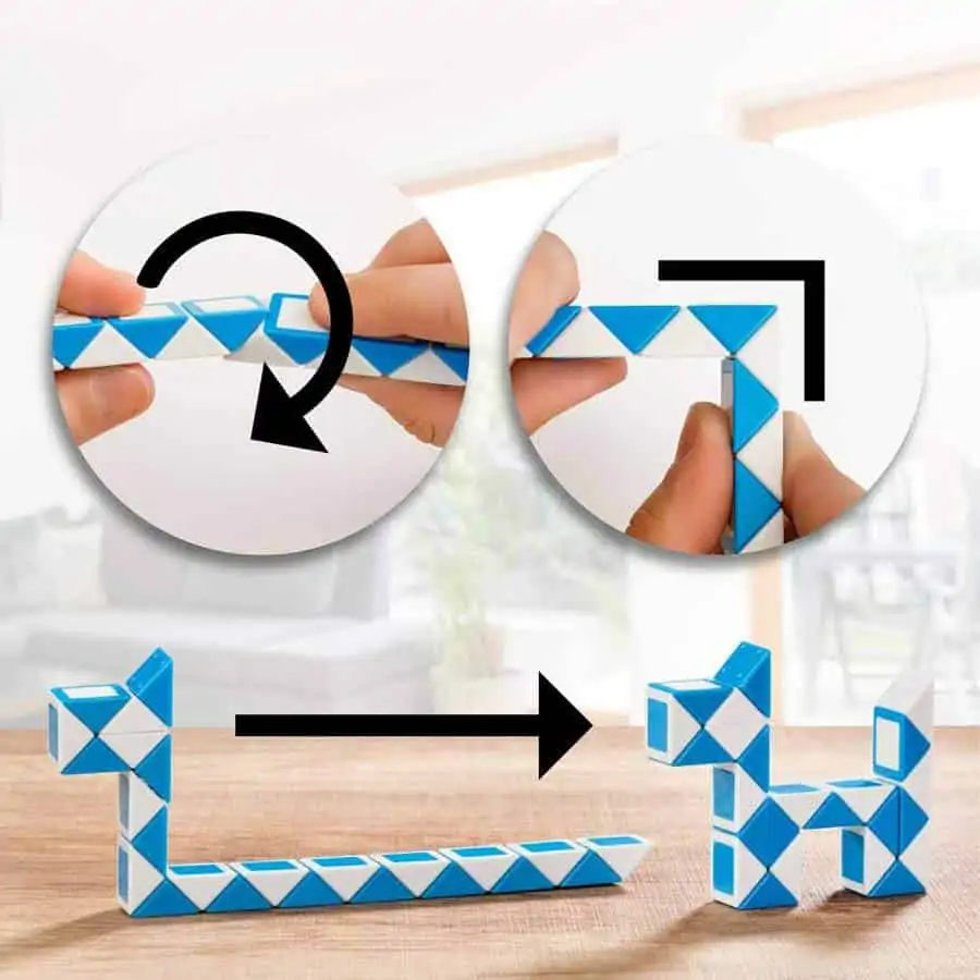 Die Cubidi Magic Snake ist ein flexibles, wandlungsfähiges Spielzeug zum Erschaffen und Nachdenken. Lass deiner Kreativität mit den 24 Blöcken freien Lauf. Die Blöcke hängen alle in einer langen Schlange zusammen. Knicke die Schlange an verschiedenen Stellen und sieh, wie sich die Form verändert. Mit ein wenig Übung kannst du tausende verschiedene Figuren nachbauen und dir deine eigenen ausdenken. Natürlich liegt jeder Magic Snake auch eine Anleitung mit verschiedenen Bauvorschlägen bei.