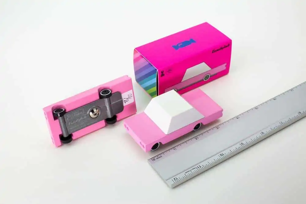 Kleines Holzauto mit pinker Lackierung und roten Heckscheinwerfern. Inklusive Reifen aus echtem Gummi, ABS Plastikfelgen und Metallachsen, die schnelles und geschmeidiges Rollen erlauben. Das alles mit der hohen Qualität und der kunstvollen Verarbeitung, die man von Candylab gewohnt ist.