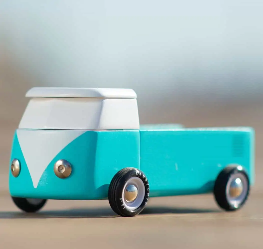 Holzauto im Stile eines amerikanischen Bus mit Surfbrett. Inklusive Reifen aus echtem Gummi, ABS Plastikfelgen und Metallachsen, die schnelles und geschmeidiges Rollen erlauben. Das alles mit der hohen Qualität und der kunstvollen Verarbeitung, die man von Candylab gewohnt ist.