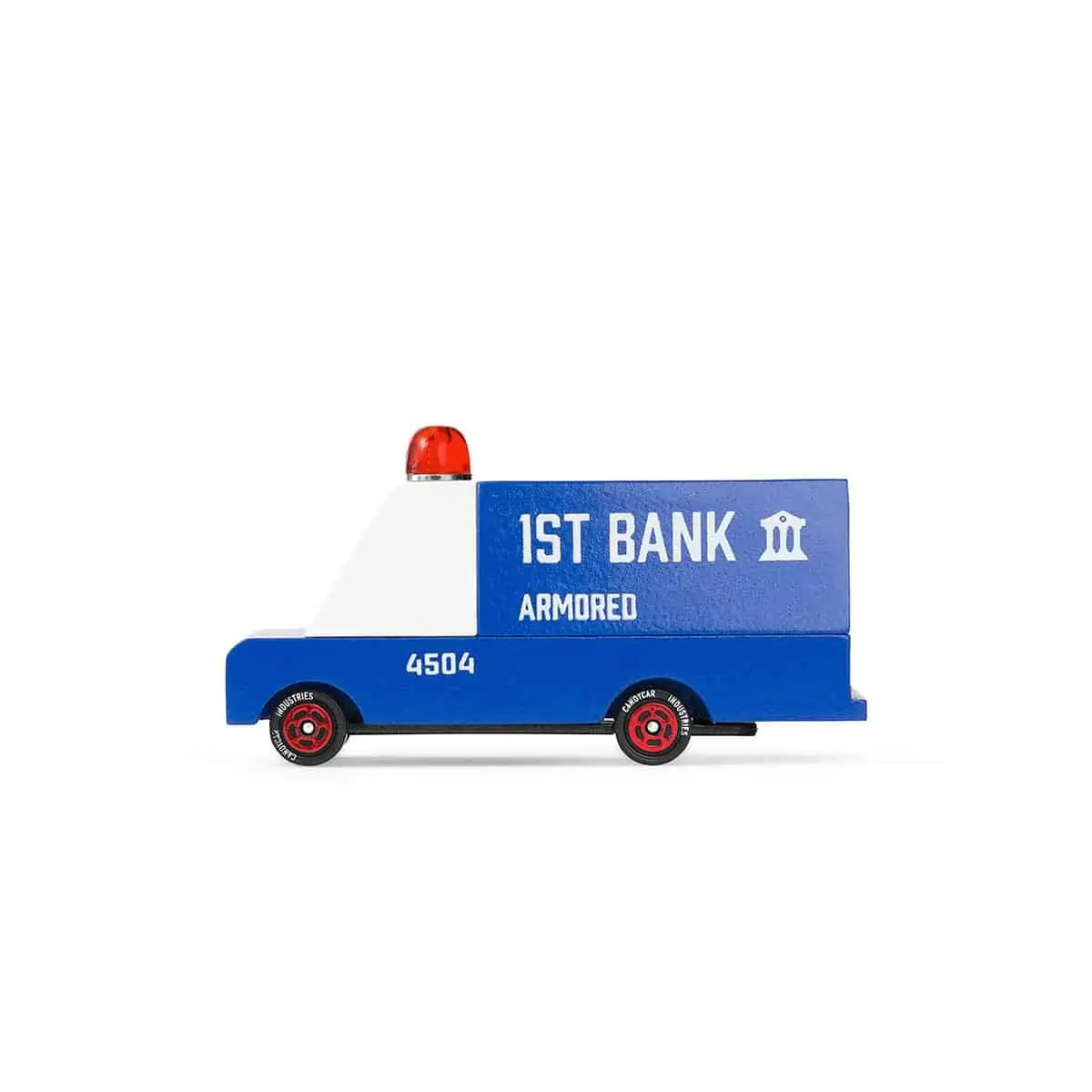 Holzauto im Stile eines gepanzerten Geldtransporters. Inklusive Reifen aus echtem Gummi, ABS Plastikfelgen und Metallachsen, die schnelles und geschmeidiges Rollen erlauben. Das alles mit der hohen Qualität und der kunstvollen Verarbeitung, die man von Candylab gewohnt ist.