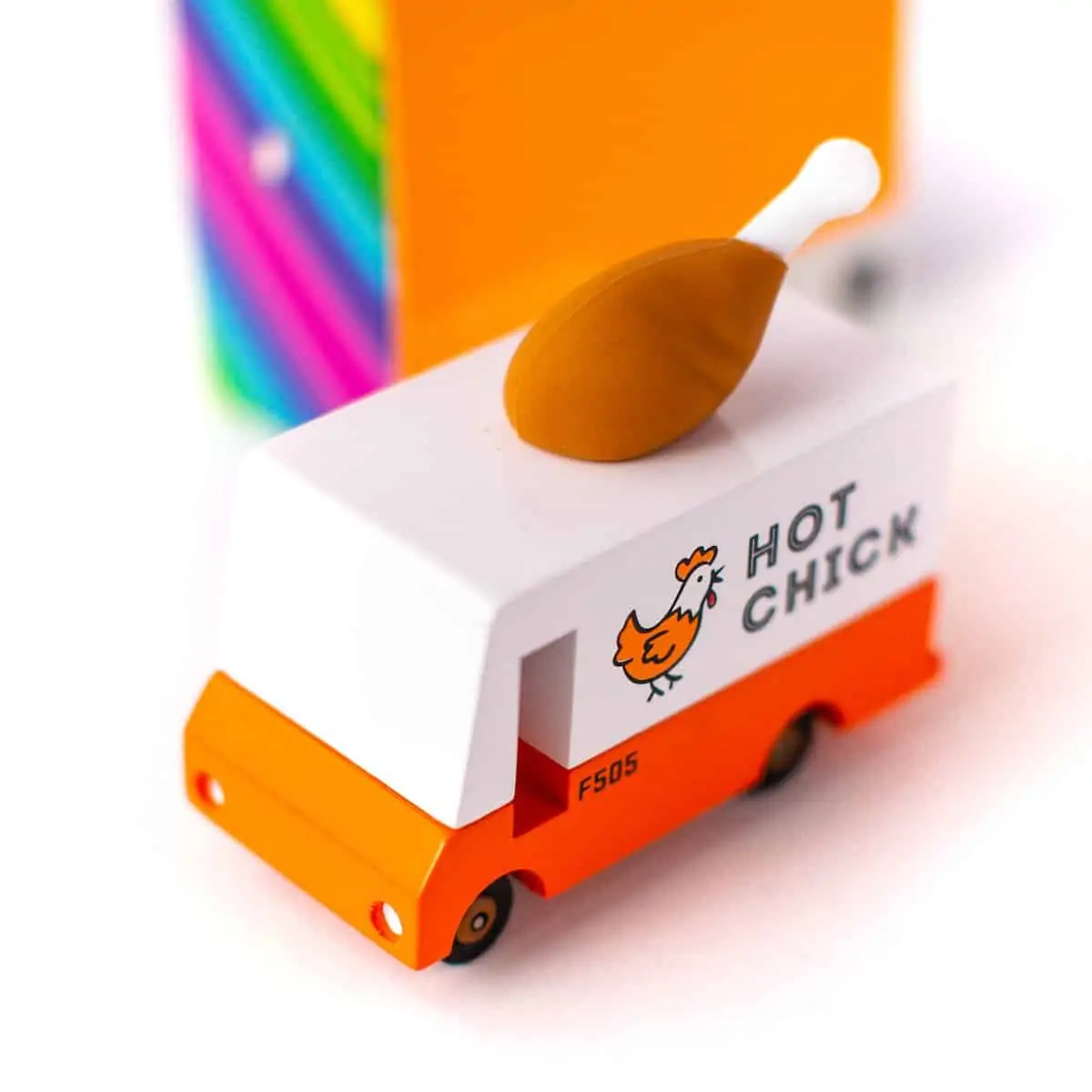 Holzauto im Stile eines fiktiven Hühnchen-Food-Trucks. Inklusive Reifen aus echtem Gummi, ABS Plastikfelgen und Metallachsen, die schnelles und geschmeidiges Rollen erlauben. Das alles mit der hohen Qualität und der kunstvollen Verarbeitung, die man von Candylab gewohnt ist.