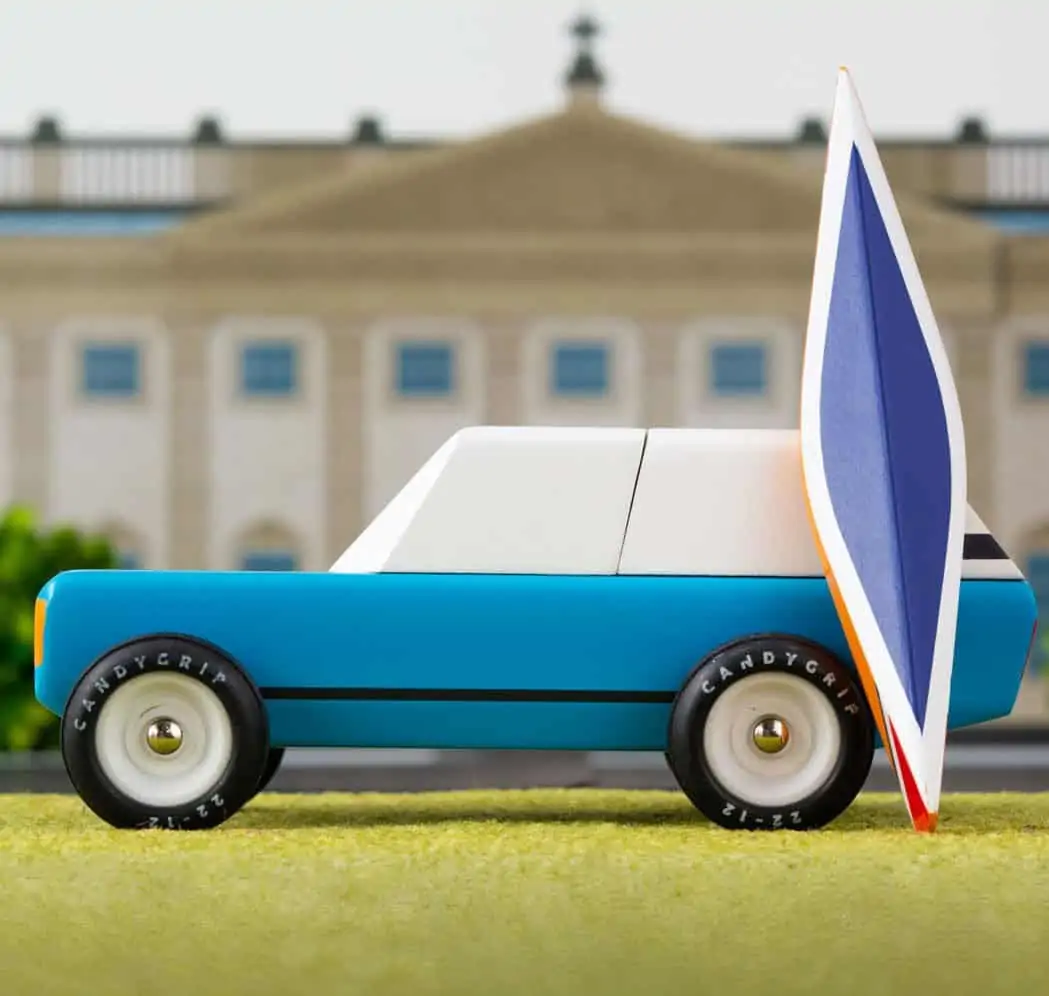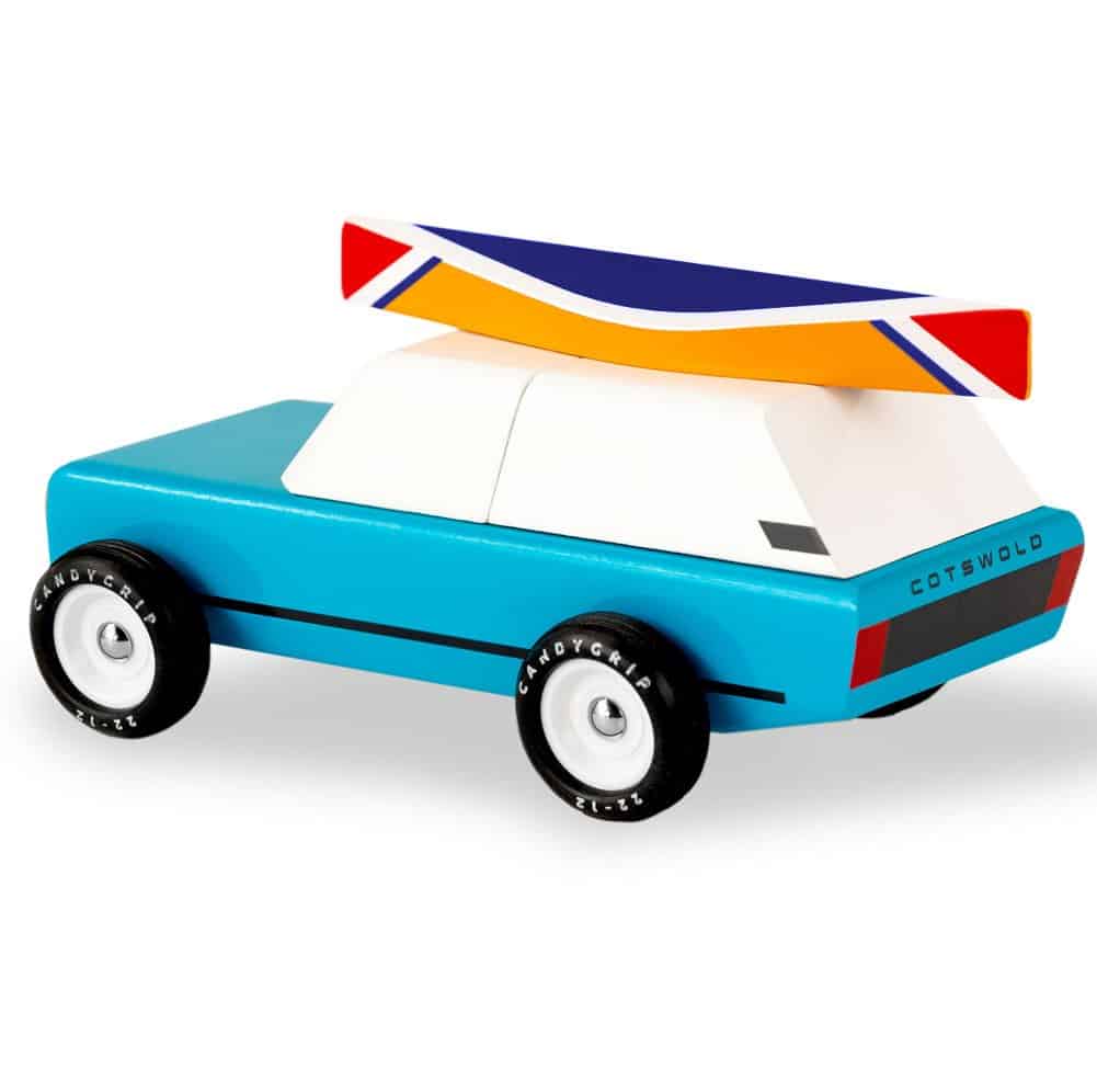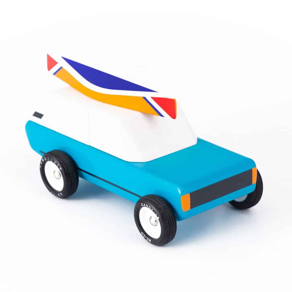 Holzauto inklusive Surfbrett. Inklusive Reifen aus echtem Gummi, ABS Plastikfelgen und Metallachsen, die schnelles und geschmeidiges Rollen erlauben. Das alles mit der hohen Qualität und der kunstvollen Verarbeitung, die man von Candylab gewohnt ist.
