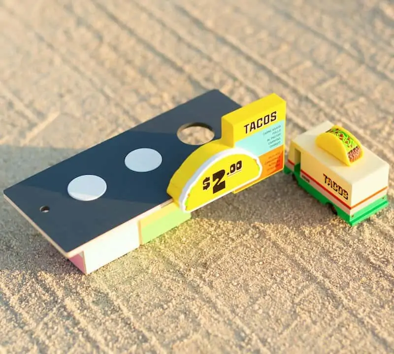 Baue mit dem modularen Set ein Drive-In-Taco-Restaurant für deine Candylab Holzautos.