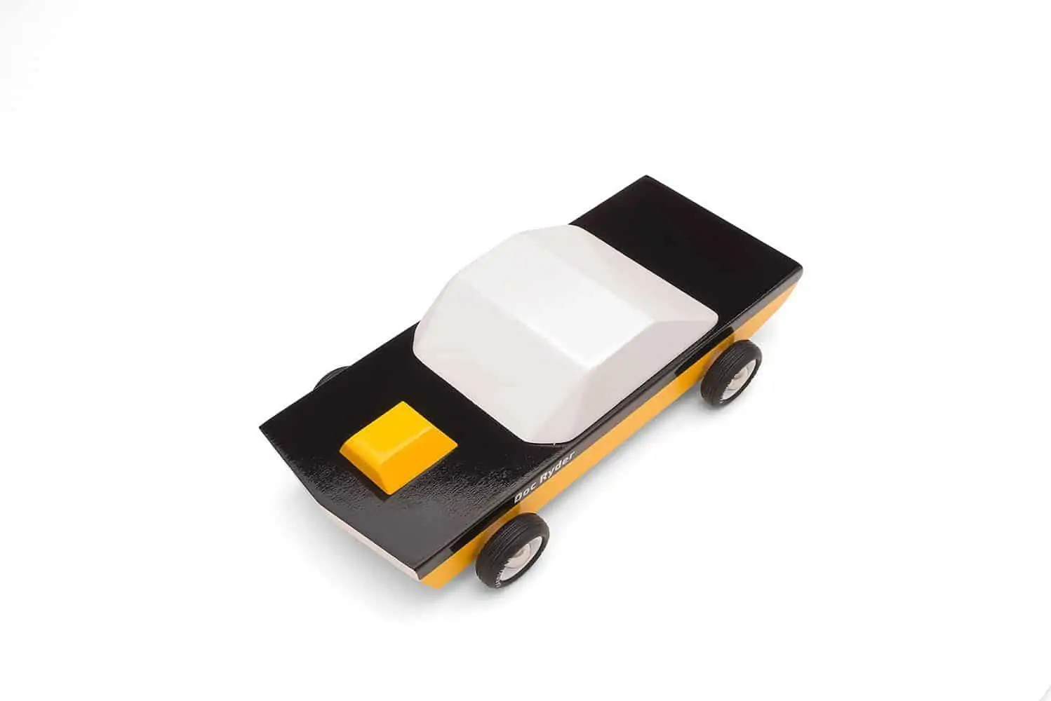 In fetzigem schwarz-gelb, mit gelber Lufthutze, bedient sich dieser Flitzer der reinen Seele eines Rennwagens. Er kommt im Stile eines amerikanischen Muscle-Car daher, inklusive Reifen aus echtem Gummi, ABS Plastikfelgen und Metallachsen, die schnelles und geschmeidiges Rollen erlauben. Das alles mit der hohen Qualität und der kunstvollen Verarbeitung, die man von Candylab gewohnt ist.