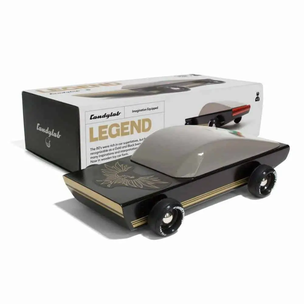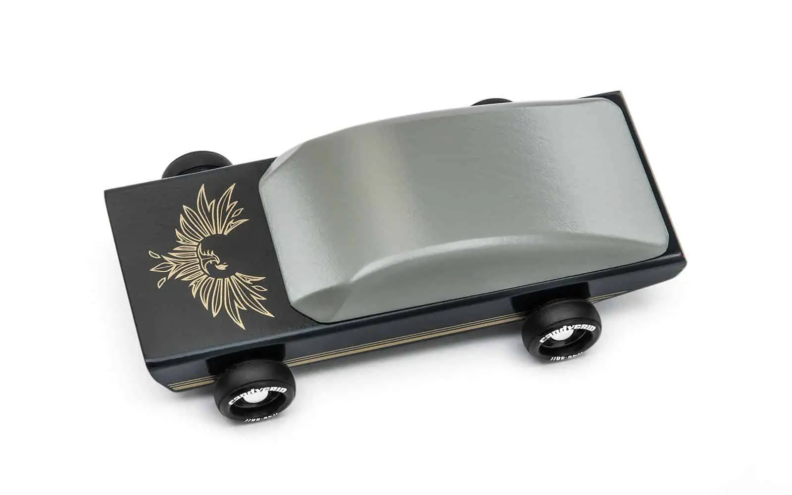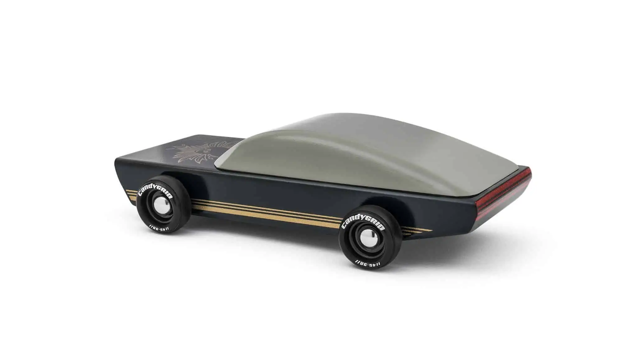 Holzauto im Stil eines Rennwagens der 1980er Jahre. Mit schwarzer Lackierung und goldenen Verzierungen. Inklusive Reifen aus echtem Gummi, ABS Plastikfelgen und Metallachsen, die schnelles und geschmeidiges Rollen erlauben. Das alles mit der hohen Qualität und der kunstvollen Verarbeitung, die man von Candylab gewohnt ist.