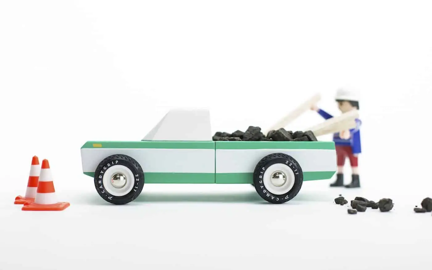 Holzauto im Stil eines Pick-Up-Truck. Mit grüner Lackierung und Ladefläche. Inklusive Reifen aus echtem Gummi, ABS Plastikfelgen und Metallachsen, die schnelles und geschmeidiges Rollen erlauben. Das alles mit der hohen Qualität und der kunstvollen Verarbeitung, die man von Candylab gewohnt ist.