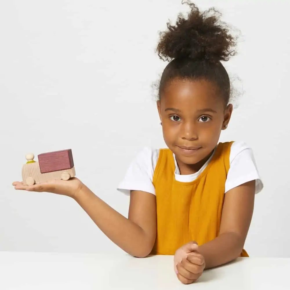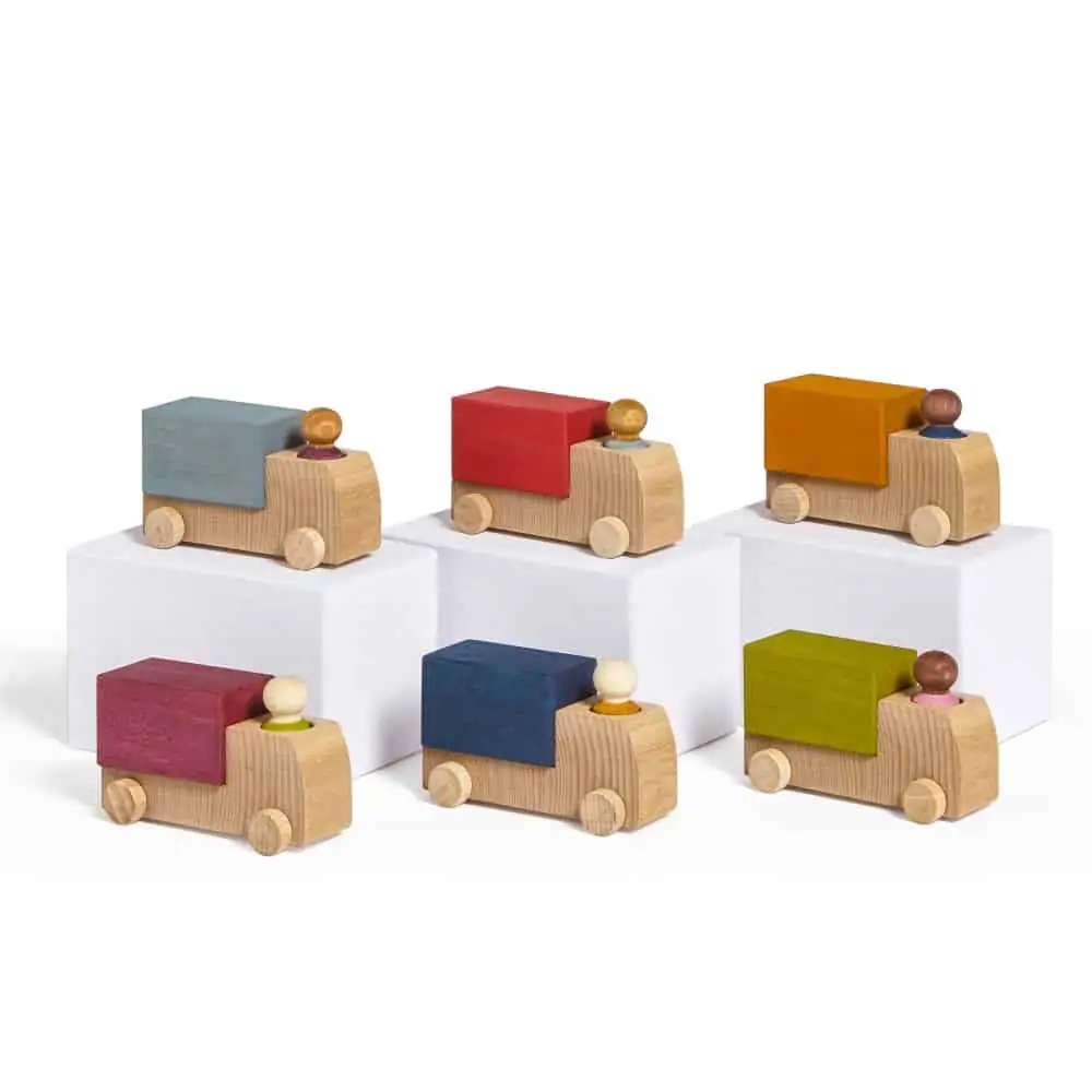 Ein kleiner Lastwagen mit einer Figur aus Holz. Eigenständig oder als Erweiterung für Lubu Town Sets verwendbar.