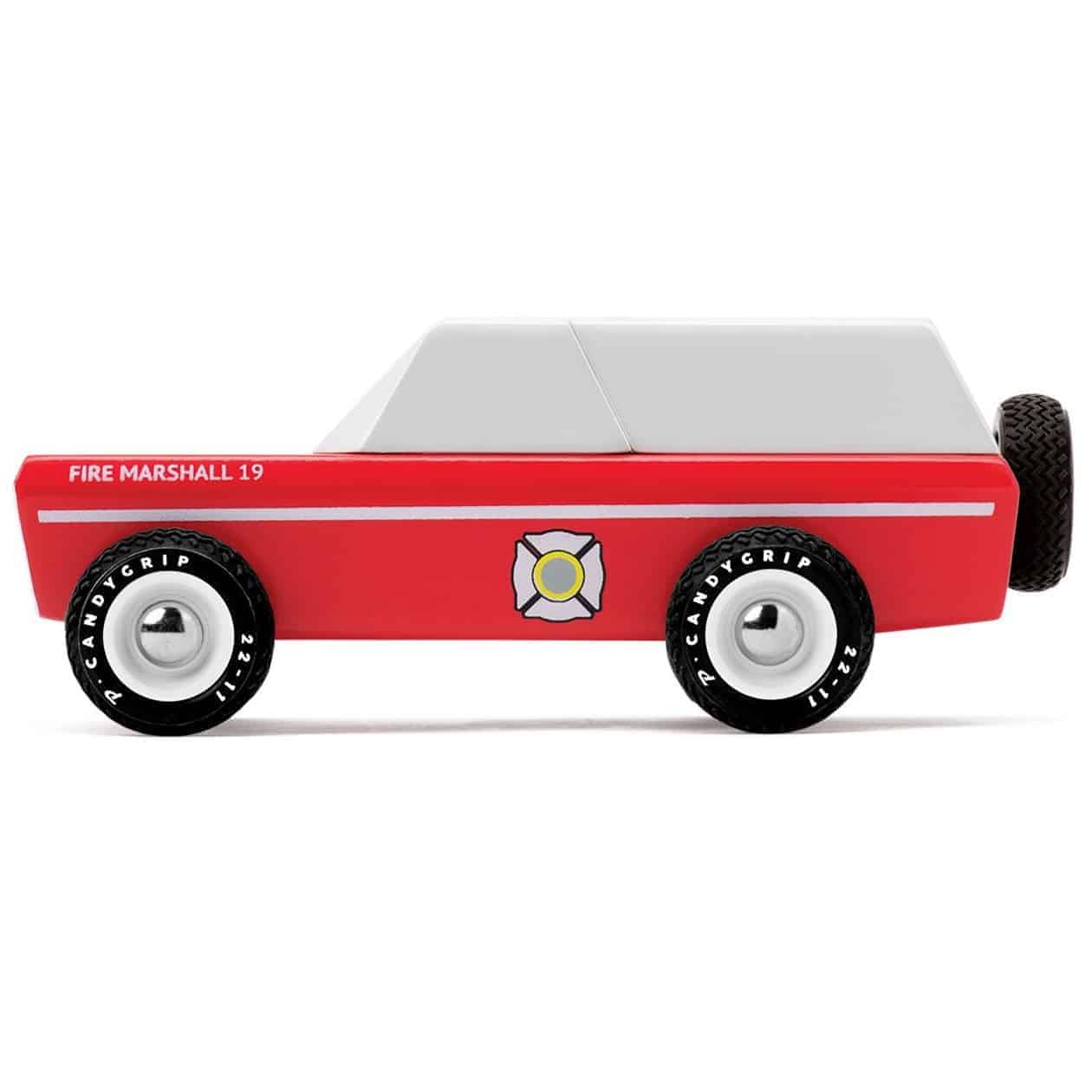 Holzauto im Stil eines amerikanischen Feuerwehr-Geländewagens. Mit glänzender roter Bemalung und schwarzem Ersatzreifen. Inklusive Reifen aus echtem Gummi, ABS Plastikfelgen und Metallachsen, die schnelles und geschmeidiges Rollen erlauben. Das alles mit der hohen Qualität und der kunstvollen Verarbeitung, die man von Candylab gewohnt ist.
