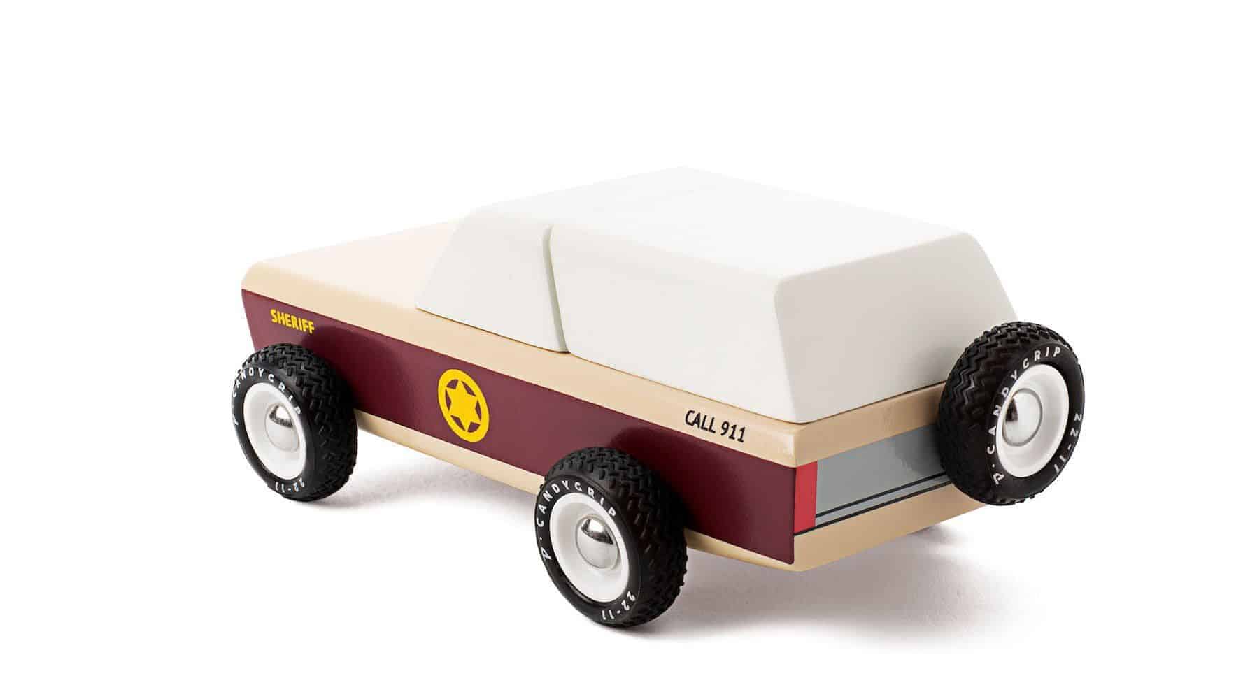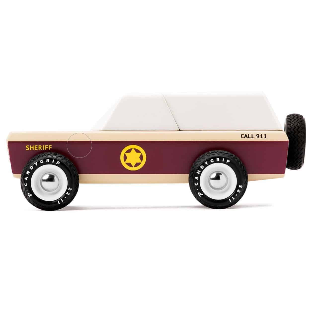 Holzauto im Stil eines amerikanischen Poilzei-Geländewagens. Mit glänzender brauner Bemalung und schwarzem Ersatzreifen. Inklusive Reifen aus echtem Gummi, ABS Plastikfelgen und Metallachsen, die schnelles und geschmeidiges Rollen erlauben. Das alles mit der hohen Qualität und der kunstvollen Verarbeitung, die man von Candylab gewohnt ist.
