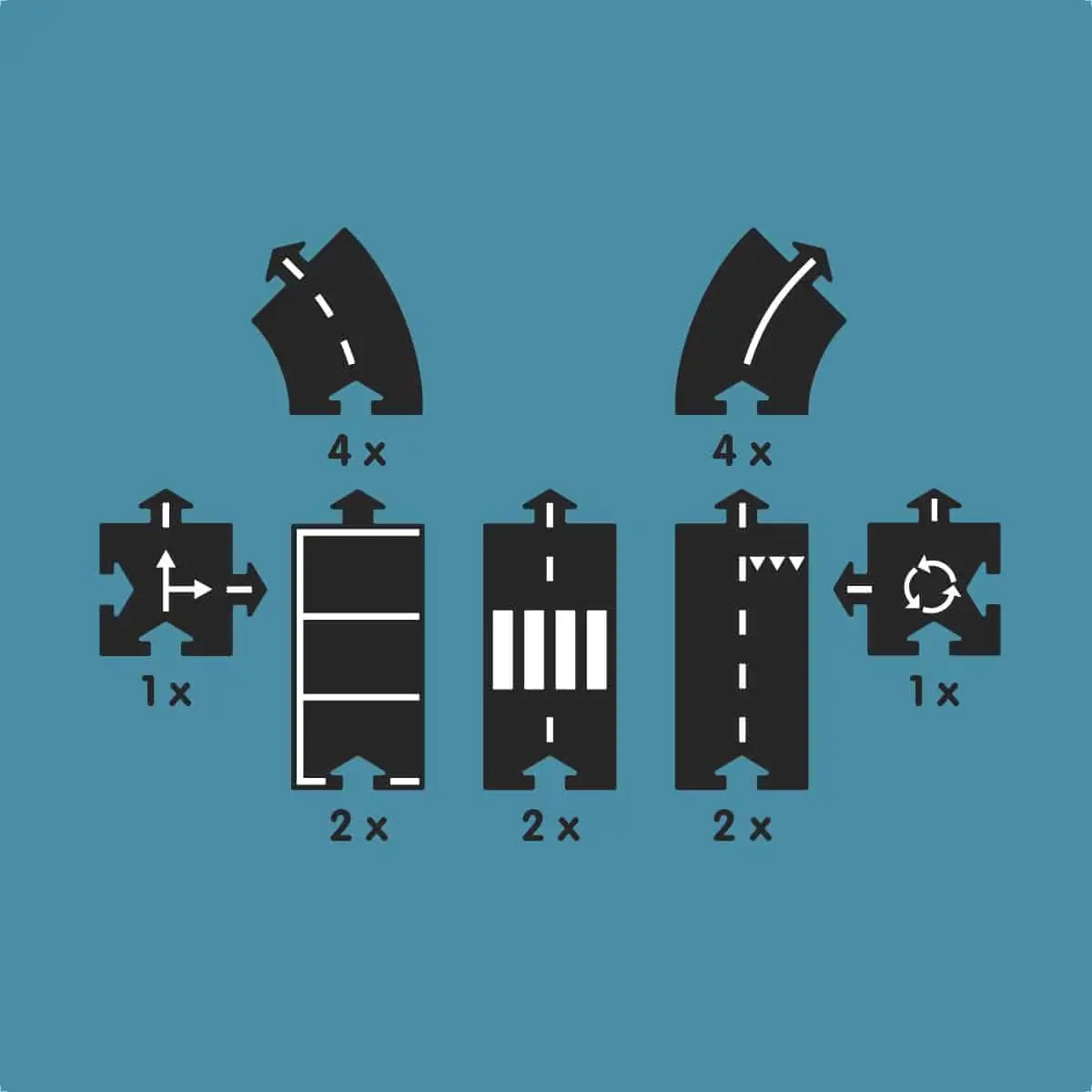 - Inhalt: 4x Gerade, 2x Parkplatz, 1x Kreuzung, 1x Kreisverkehr, 4x Linkskurve, 4x Rechtskurve