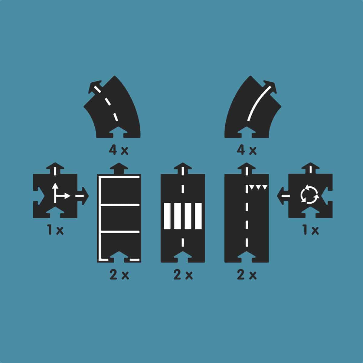 • Inhalt: 4x Gerade, 2x Parkplatz, 1x Kreuzung, 1x Kreisverkehr, 4x Linkskurve, 4x Rechtskurve