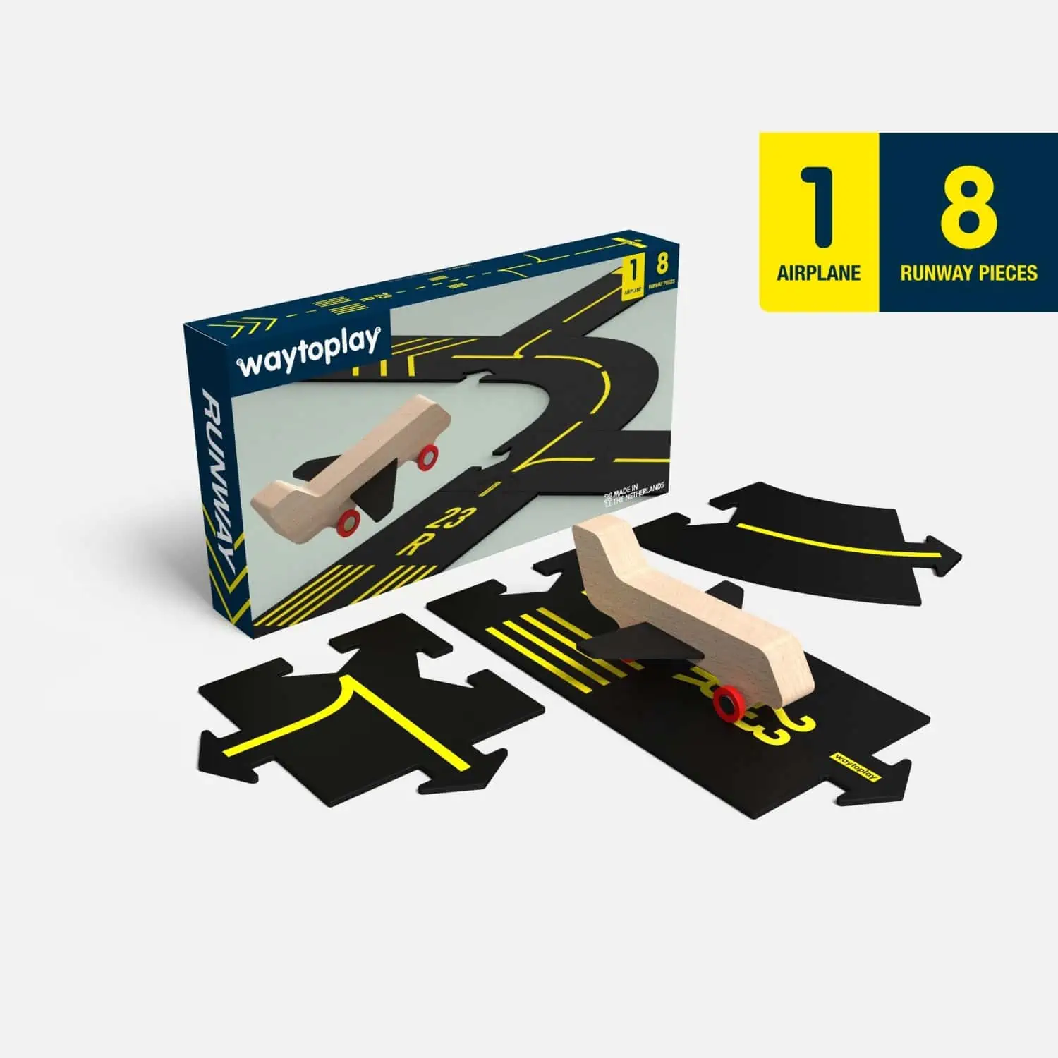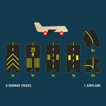 Das Way to play Runway Set umfasst 8 Landebahnteile und ein Flugzeug mit authentischen, gelben Flughafenmarkierungen für drinnen und draußen.