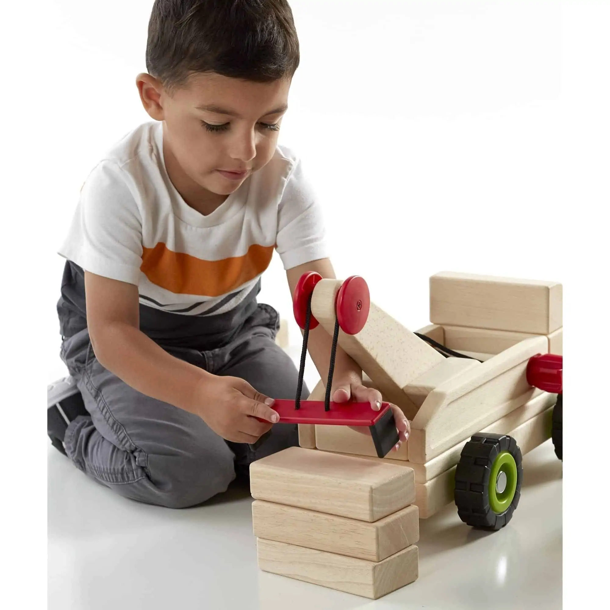 Abschleppen & forschen: Buchenholz-Truck mit Kurbel und Flaschenzug – Unit Blocks einhängen, heben/senken (einfaches Maschinenprinzip). Ca. 14×28,6×38,7 cm. Ab 3+.