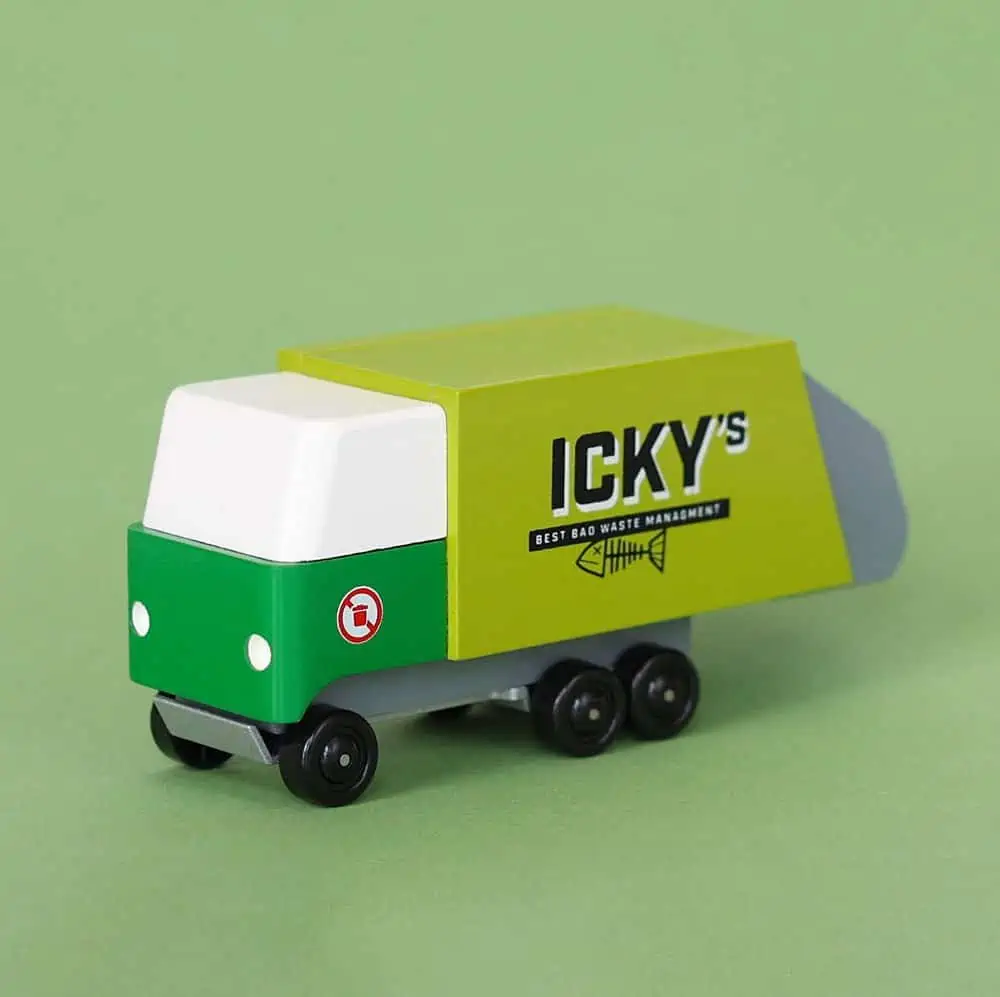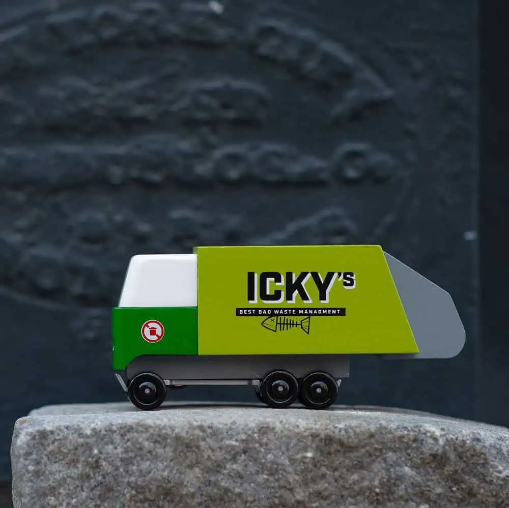 Holzauto im Stile eines amerikanischen Müllabfuhr-Trucks mit grün-weißer Lackierung. Inklusive Reifen aus echtem Gummi, ABS Plastikfelgen und Metallachsen, die schnelles und geschmeidiges Rollen erlauben. Das alles mit der hohen Qualität und der kunstvollen Verarbeitung, die man von Candylab gewohnt ist.