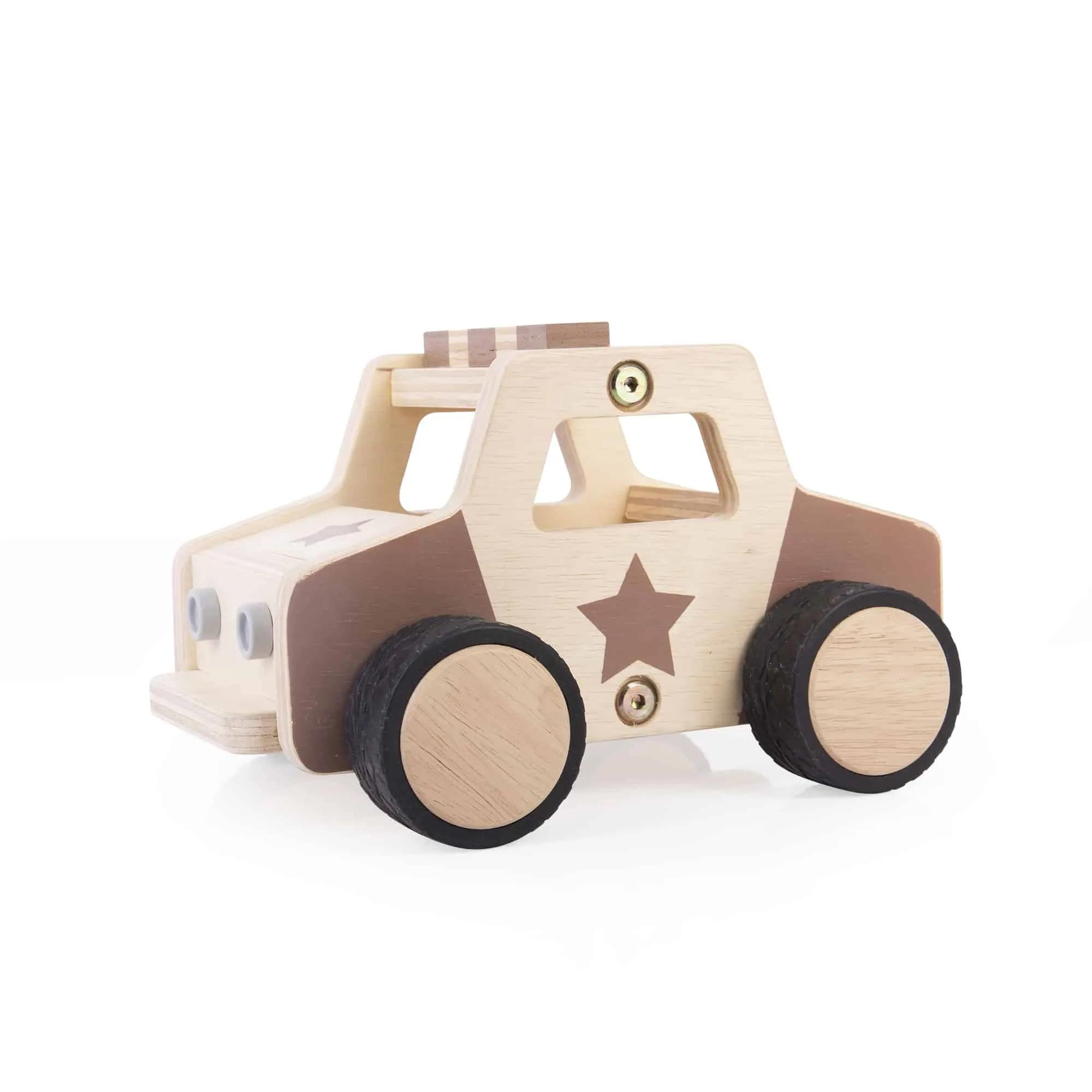 Das Wooden Police Car ergänzt jede Blockspiel-Station um ein langlebiges Einsatzfahrzeug. Der Birken-Sperrholz-Korpus mit naturgetönten Druckdetails ist auf tägliche Nutzung ausgelegt; die rutschfesten Soft-Räder rollen ruhig und schonen den Boden. Durch die kompakte Tischgröße lässt sich das Fahrzeug leicht greifen, fahren und in Stadt- und Rettungsszenen integrieren. Vollmontiert geliefert – auspacken und losspielen.