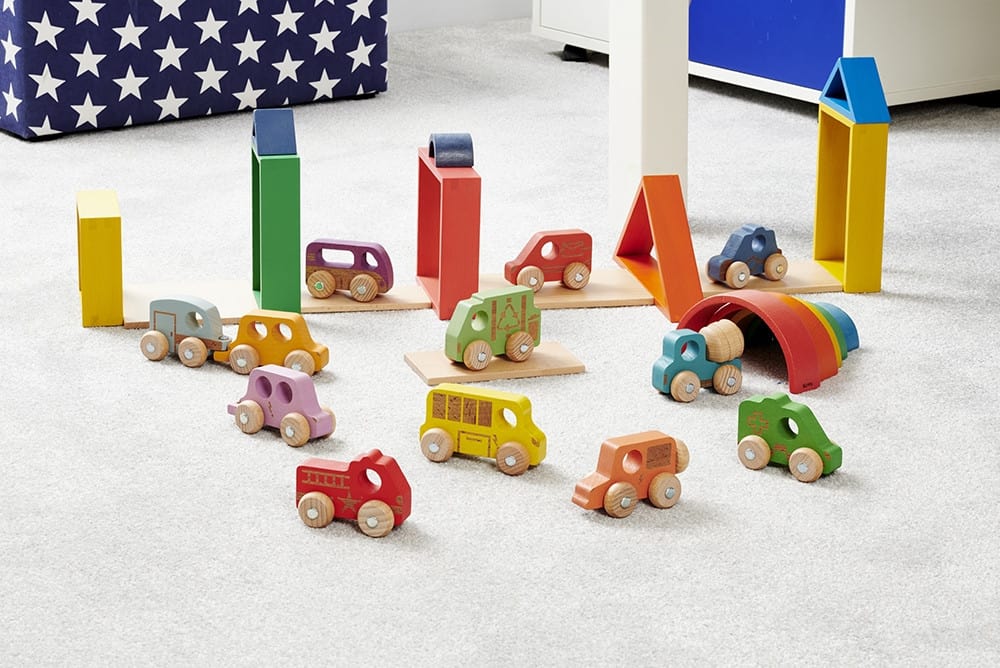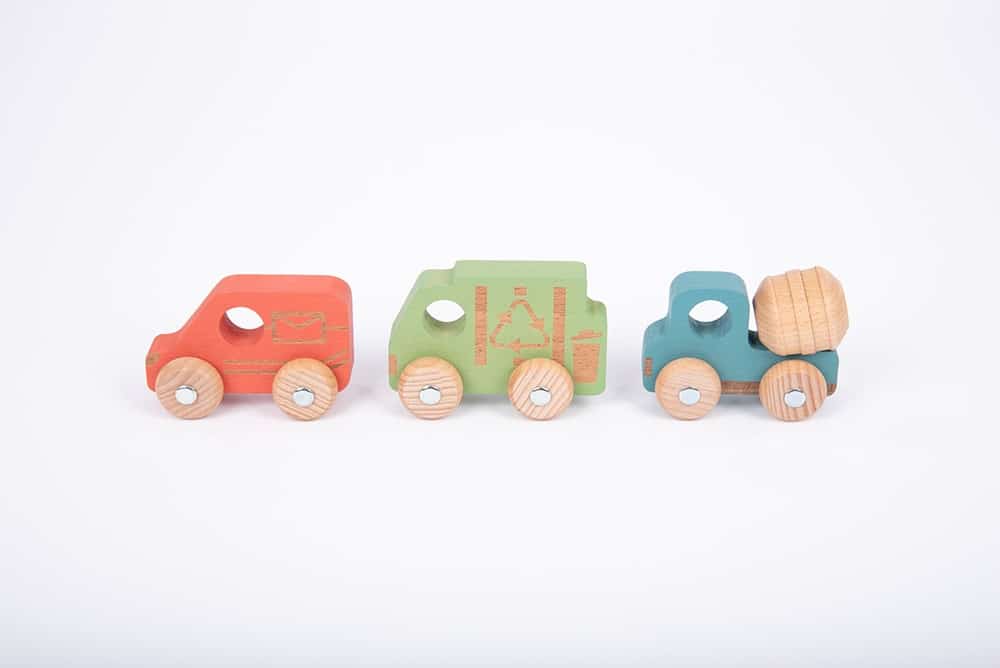 3 Holzfahrzeuge aus solidem Buchenholz. Mit Metallachsen und gelaserten Details.