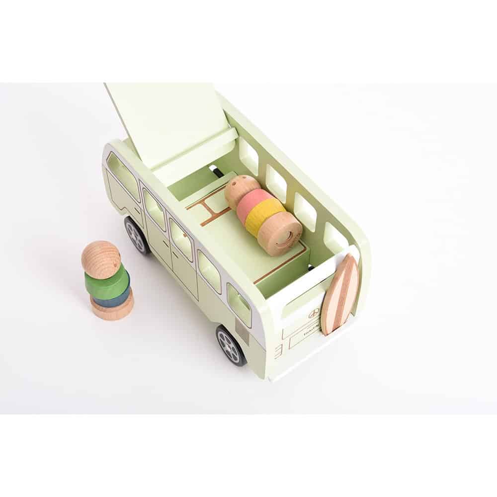 Holzfahrzeug in Form eines Vans. Inkl. zwei Figuren und Surfbrett.