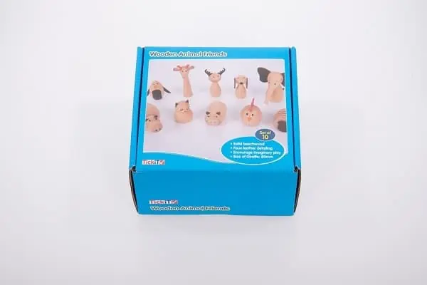 Holzspielzeug in Form von verschiedenen Tieren. Mit detailgetreuen Faux-Leder Details. Ab 3 Jahre.