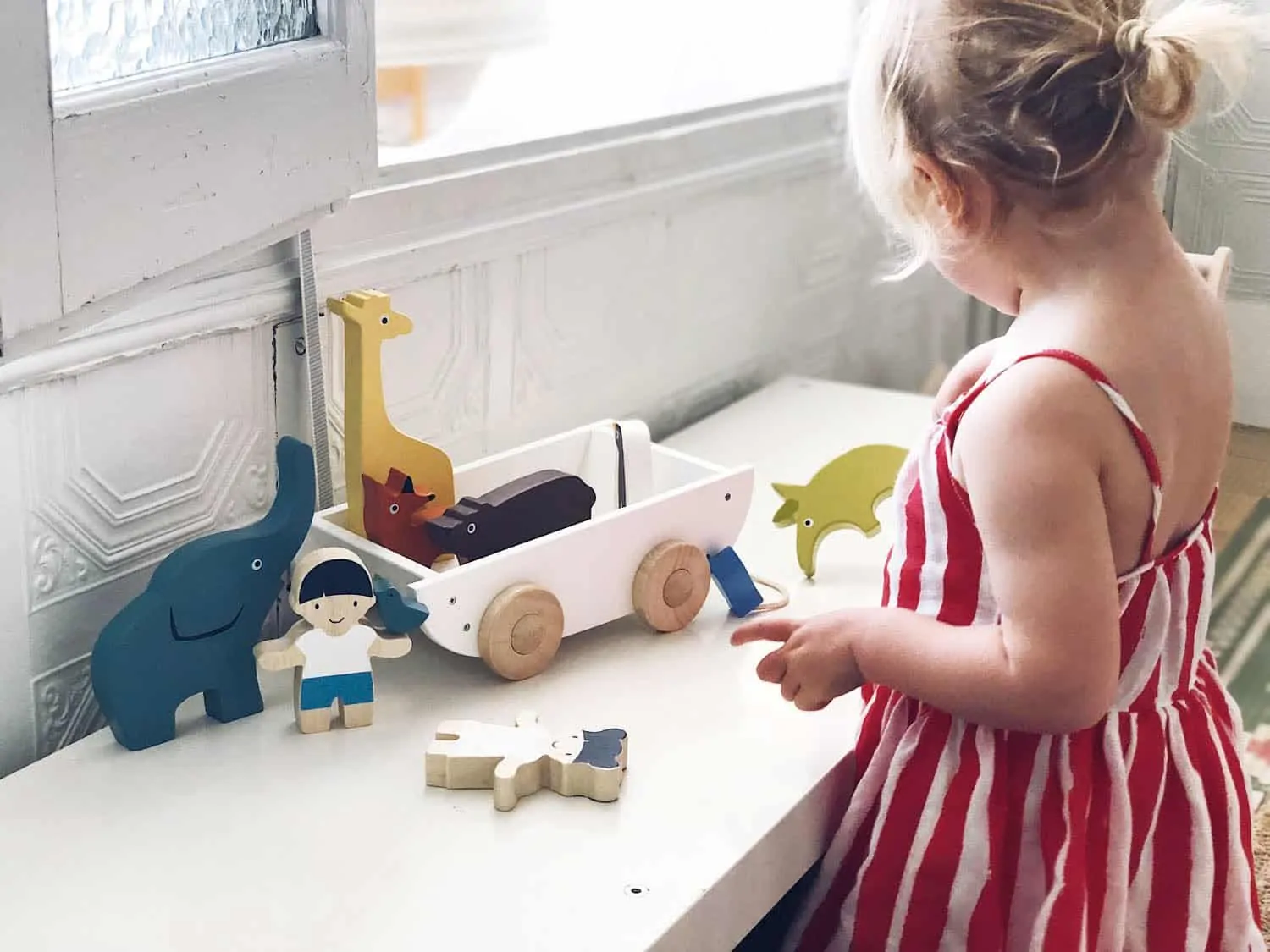 Holzboot mit Rädern, zwei Spielfiguren (Junge/Mädchen) und Tierfiguren aus Holz: Elefant, Giraffe, Ameisenbär, Elefant, Fuchs und Bär. Die Holztiere können gestapelt werden.