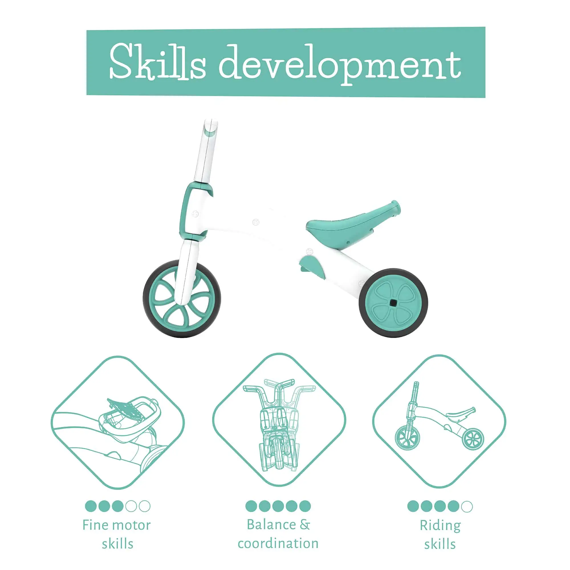 - Dreiräder (Tricycles): Entwickelt, um Kleinkindern sicheren und unterhaltsamen Fahrspaß zu bieten. Der Quadie kombiniert Einfachheit mit stilvollem Design und der Bunzi lässt sich leicht von einem Dreirad in ein Laufrad umwandeln, perfekt für die ersten Fahrversuche. Ideal für erste Fahrerfahrungen.
