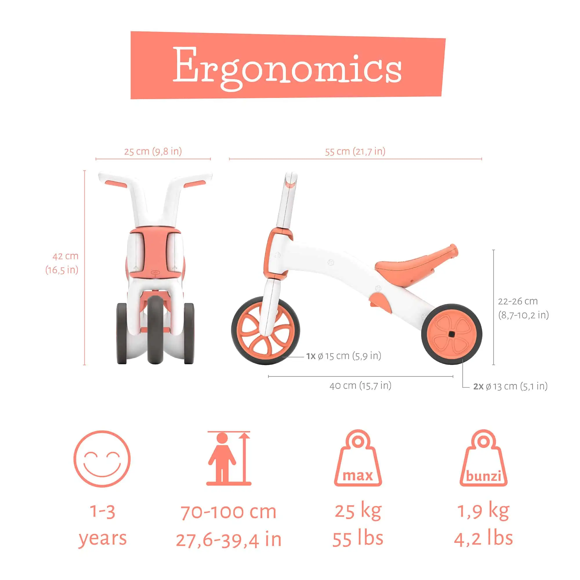 Das Chillafish Bunzi ist von Boden bis Lenker etwa 42 cm hoch und 55 cm lang. Die Sitzhöhe ist von 22 cm bis 26 cm ohne Werkzeug einstellbar. Das Laufrad eignet sich für Kinder von etwa 1-3 Jahren mit einer Größe von 70 cm bis max. 1 m und einem Maximalgewicht von 25 kg. Das Bunzi selbst ist mit 1,9 Kilo ein Leichtgewicht.