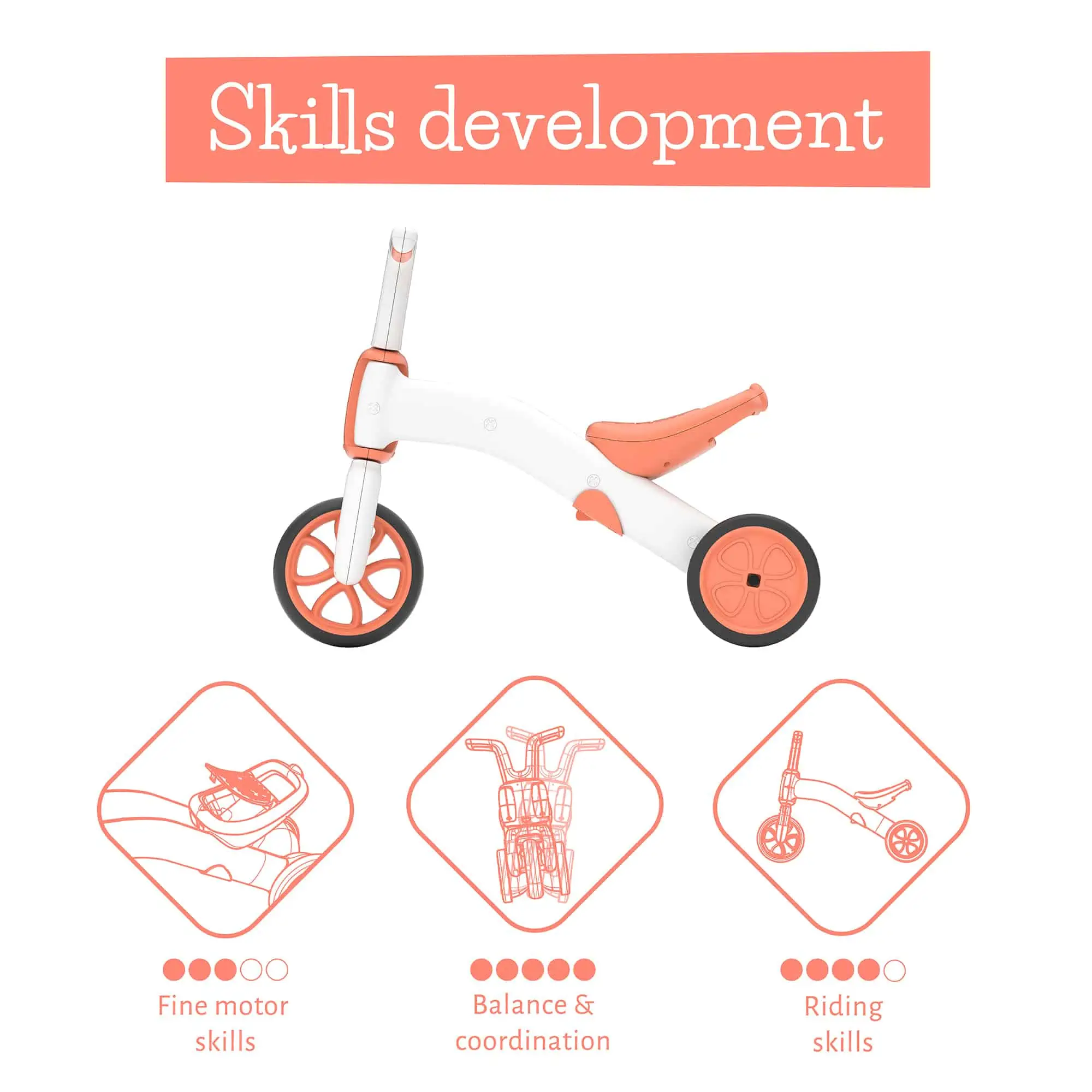 - Laufräder (Balance Bikes): Unsere Laufräder, wie der BMXie Vrooom, BMXie2, BMXie Glow, und Charlie Sport, fördern effektiv das Gleichgewicht und die Selbstständigkeit. Fördert aktives Lernen und frühe Fahrradbeherrschung.
