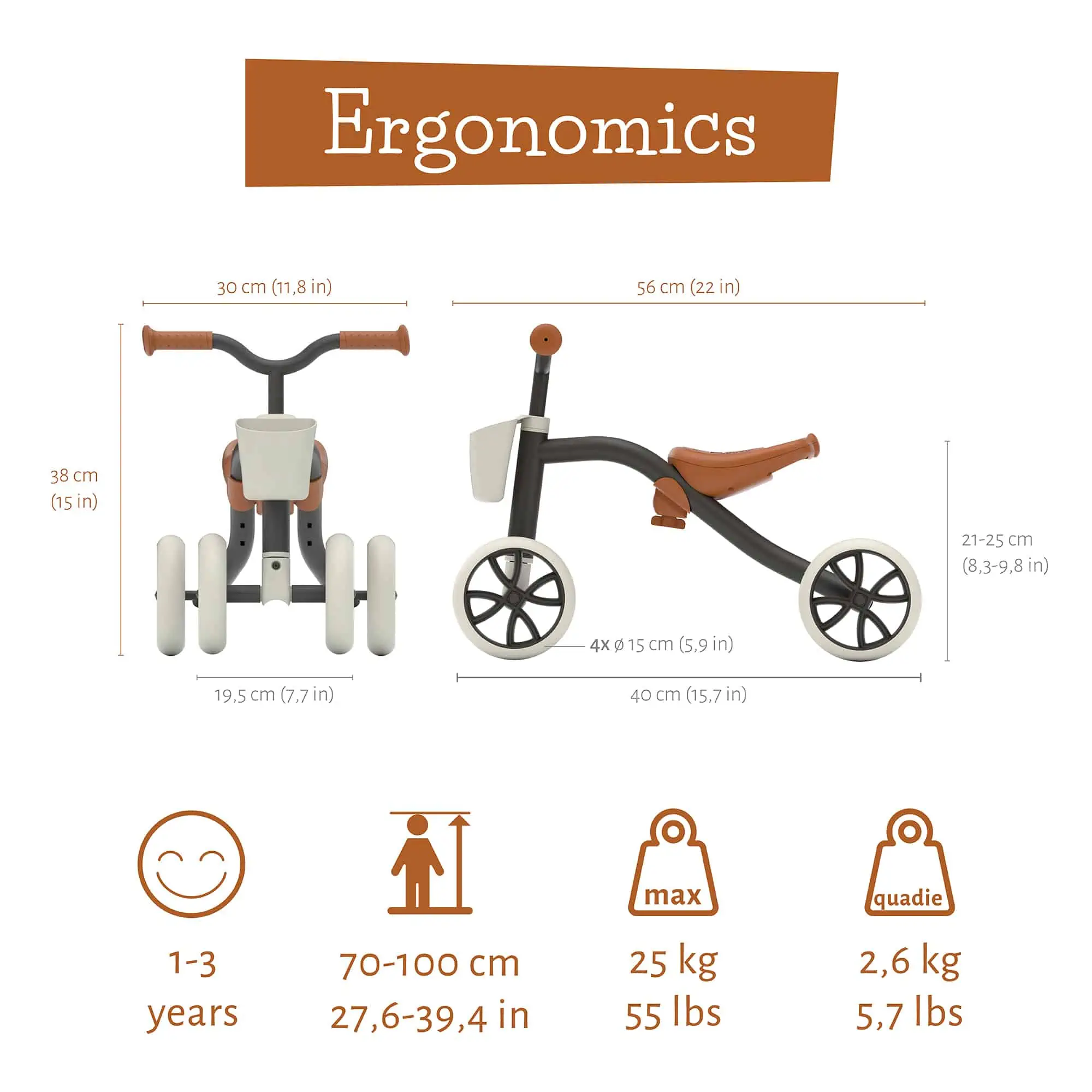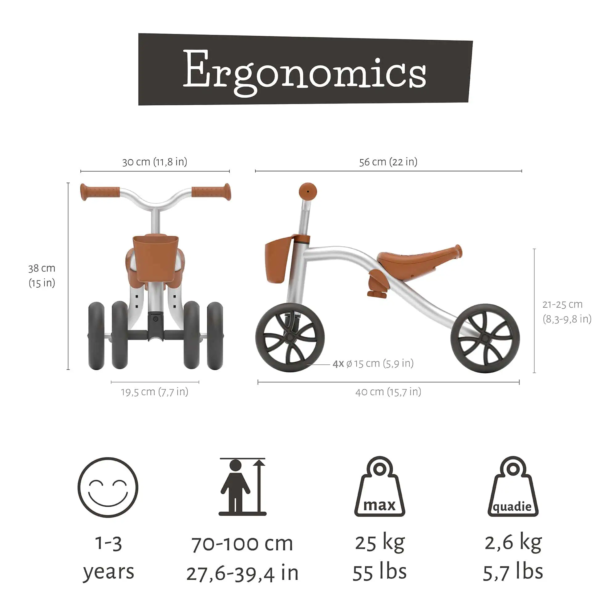 Das Quadie Basket ist von Boden bis Lenker etwa 38 cm hoch und 56 cm lang. Die Sitzhöhe ist von 21 cm bis 26 cm über die Schraube unter dem Sitz ohne Werkzeug einstellbar. Das Laufrad eignet sich für Kinder von etwa 1-3 Jahren mit einer Größe von 70 cm bis max. 1 m und einem Maximalgewicht von 25 kg. Das Quadie selbst ist mit 2,6 Kilo ein Leichtgewicht. Dank der TPE-Reifen kannst du dein Fahrzeug sowohl drinnen als auch draußen benutzen. Außerdem sind die Reifen sehr leise. Sie rutschen nicht und sie quietschen nicht. Das Chillafish Quadie Basket ist mit schwarzem oder silbernen Rahmen erhältlich.