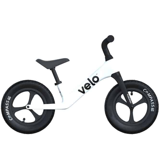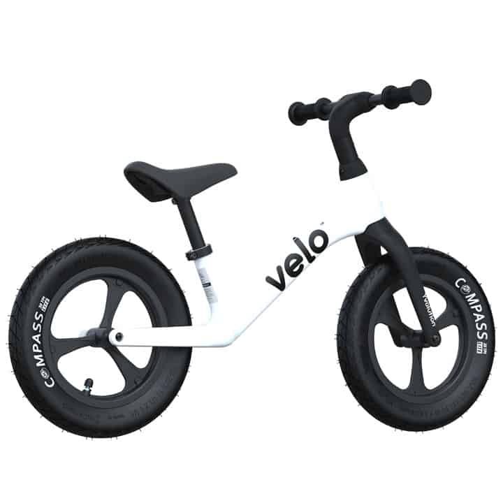 Höhenverstellbares Laufrad in Schwarz-Weiß für Kinder zwischen 3 und 4 Jahren. Auch in der Junior-Variante mit doppeltem Hinterreifen erhältlich.