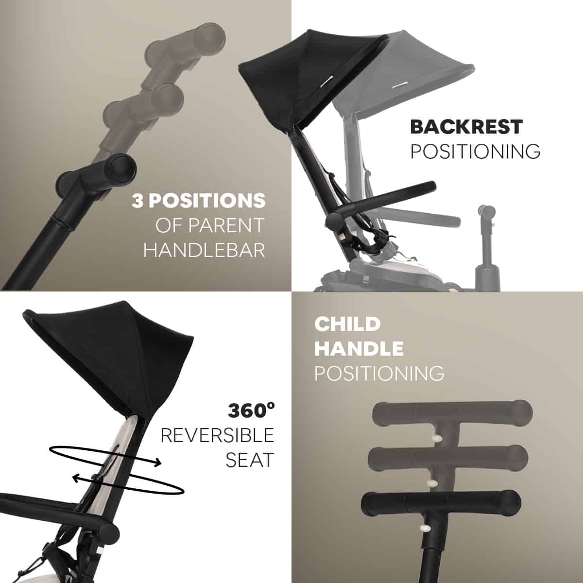 Der drehbare Sitz mit 360°-Funktion erlaubt es, entweder zu den Eltern oder in Fahrtrichtung zu schauen. Eine höhenverstellbare Schiebestange (3 Positionen), ein 5-Punkt-Gurt, ein verstellbares Rückenlehnen-System (2 Positionen) und ein Sonnendach sorgen für angenehme Spaziergänge – ob Stadt oder Natur.