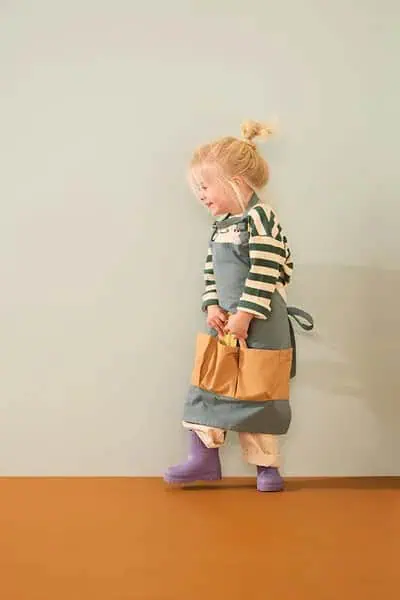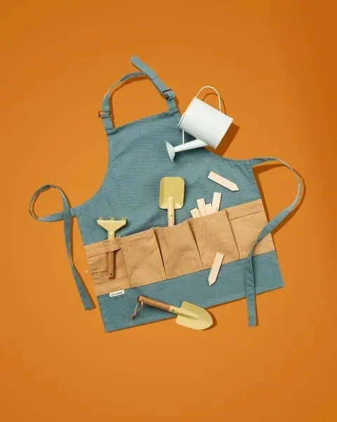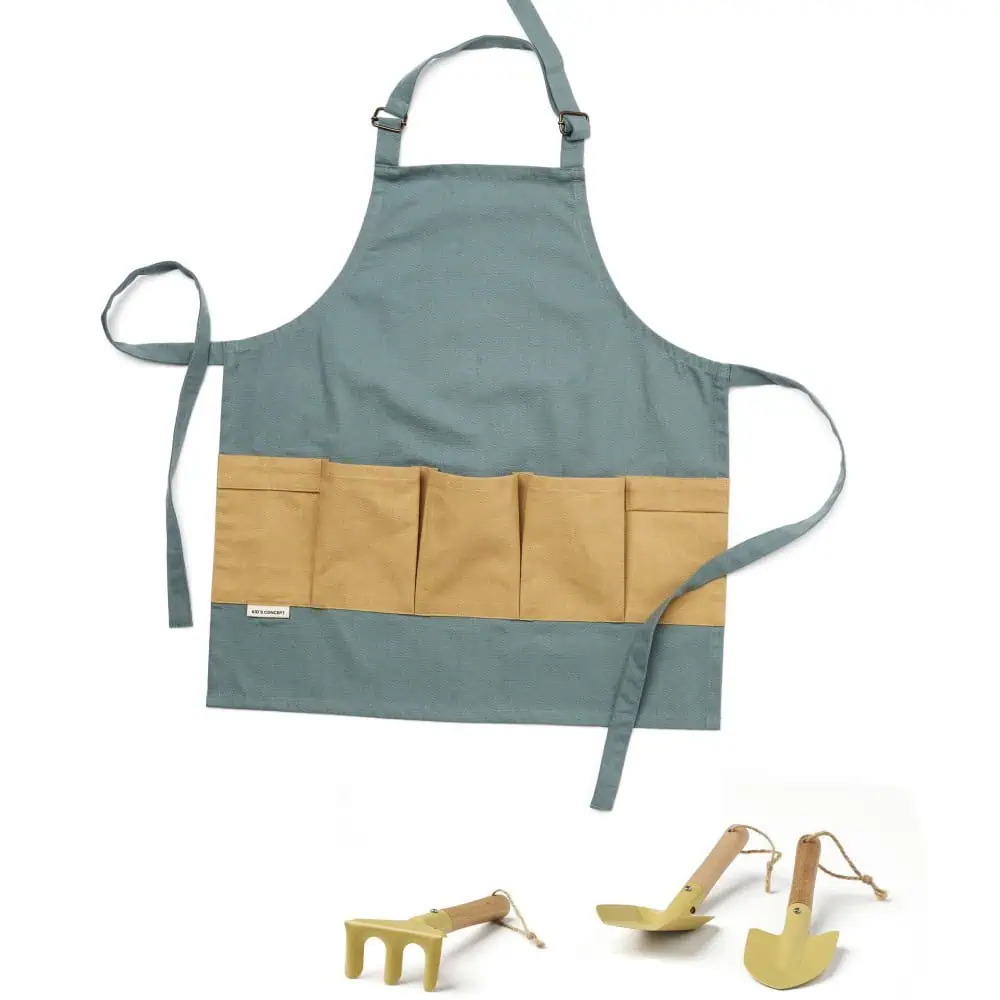 Praktische, wasserabweisende Schürze mit verstellbaren Messingverschlüssen und drei Taschen. Robuste Gartenwerkzeuge aus Holz und Metall, ideal für kleine Hände. Perfekt für Gartenarbeit und kreatives Spielen.