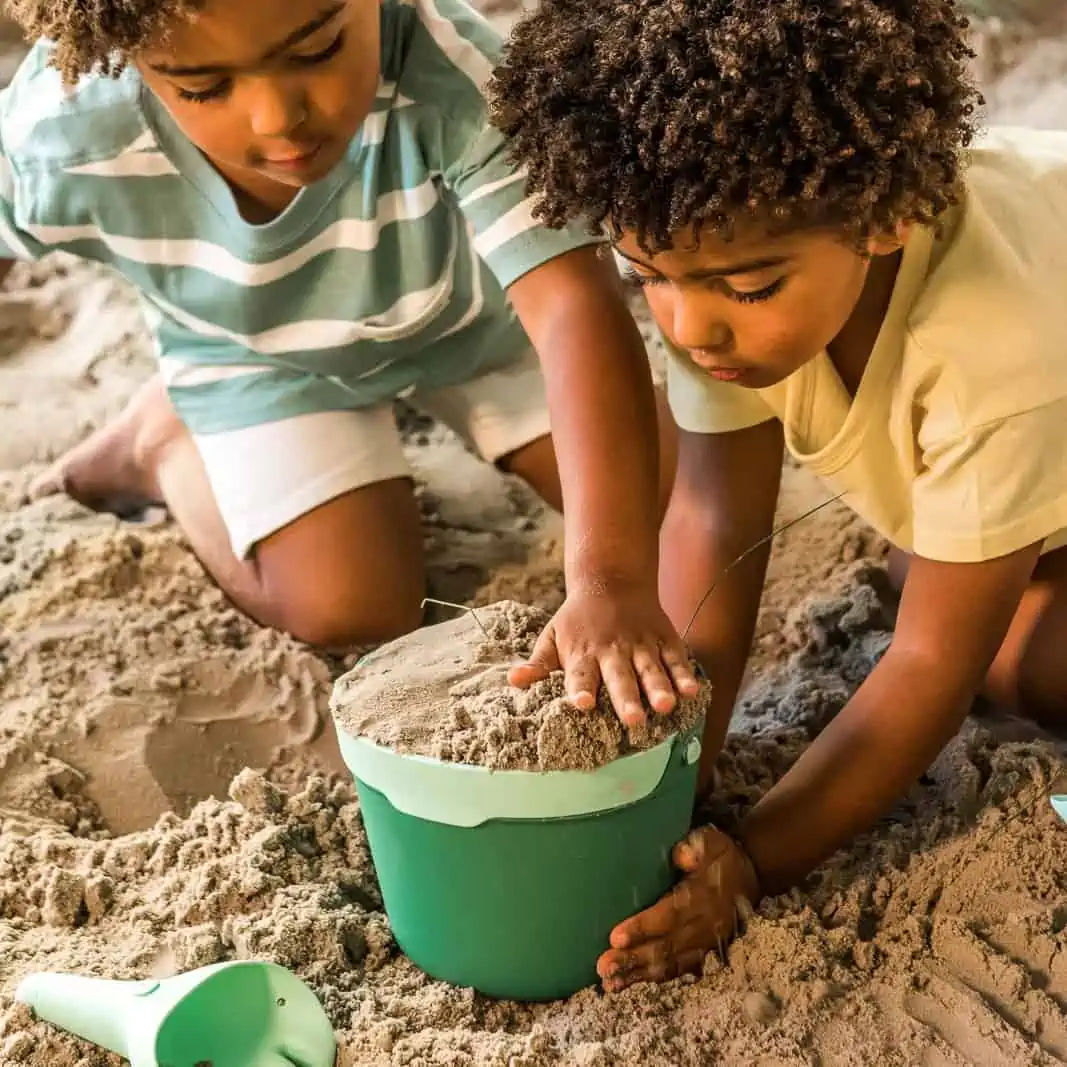 Beim Schaufeln, Gießen und Formen wachsen Feinmotorik, Hand-Auge-Koordination und räumliches Denken. Offene Spielsituationen fördern Kreativität, Teamarbeit und erste STEAM-Impulse (Fluss, Volumen, Statik).