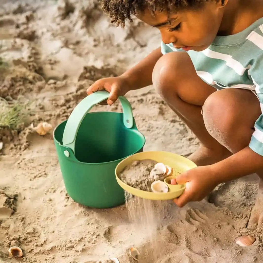 Bucki ist der neueste Spieleimer der belgischen Designer von Quut. Nach Ballo ist er der zweite Eimer im Sortiment. Er steht seinem Vorbild aber in nichts nach. Auch mit Bucki kannst du stundenlang Spaß haben – ob am Strand, im Bad oder im Planschbecken. Nutze den Eimer und das passende Sieb zum Sammeln, Waschen und Transportieren. Du wirst erstaunt sein, was du im Sand so alles finden kannst. Oder baust du lieber Sandburgen? Dann ist Bucki dein perfekter Begleiter! Seine gefällige Form und der einrastbare Haltegriff machen ihm zum perfekten Hilfswerkzeug. Auch ohne Sand oder Wasser in der Nähe ist der Spieleimer nützlich. Sammle Blätter, Zweige, kleine Blumen oder was du sonst in der Natur findest.