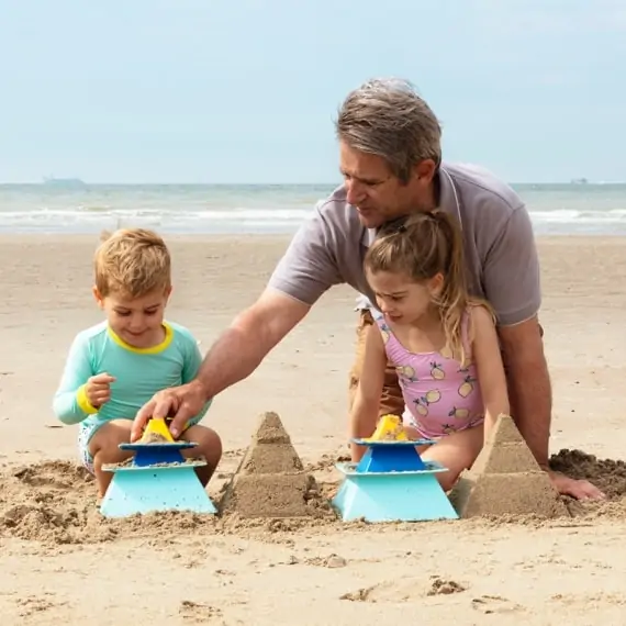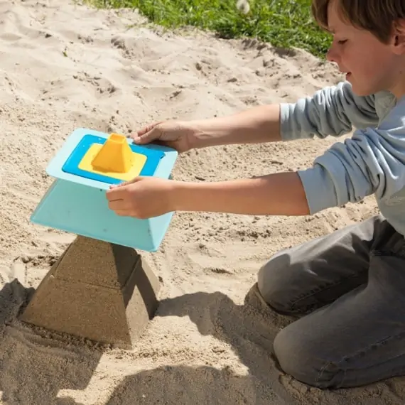 Mit den Quut Pira Sandförmchen erschaffst du Pyramiden aus Sand. Das Set besteht aus 3 Förmchen in verschiedenen Farben und Größen. Mit ihnen ist es kinderleicht, eine schöne Pyramide zu erstellen. Nimm zuerst die größte Form und fülle sie beispielsweise mit feuchtem Sand. Stelle dann die mittlere Form drauf und befülle sie ebenfalls. Als letztes ist die kleinste Form dran, die Spitze. Befülle auch sie und stell sie ganz oben auf deine Pyramide. Jetzt kannst du alle drei Förmchen von unten nach oben wegziehen. Dank des cleveren Designs passen die Formen perfekt ineinander. So kannst du Pyramide um Pyramide erstellen oder noch kreativer werden. Lass die Mitte weg und nimm vier Spitzen, erweitere deine runde Sandburg um eckige Elemente oder lass probiere tolle eigene Ideen aus. Das Set Pira hat die Maße 22,5 x 22,5 x 9 und wiegt etwa 300 Gramm.