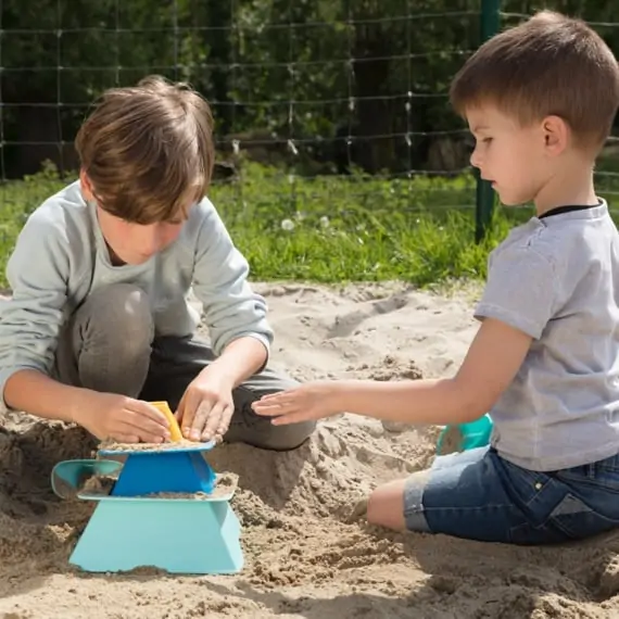 Beim Schaufeln, Gießen und Formen wachsen Feinmotorik, Hand-Auge-Koordination und räumliches Denken. Offene Spielsituationen fördern Kreativität, Teamarbeit und erste STEAM-Impulse (Fluss, Volumen, Statik).