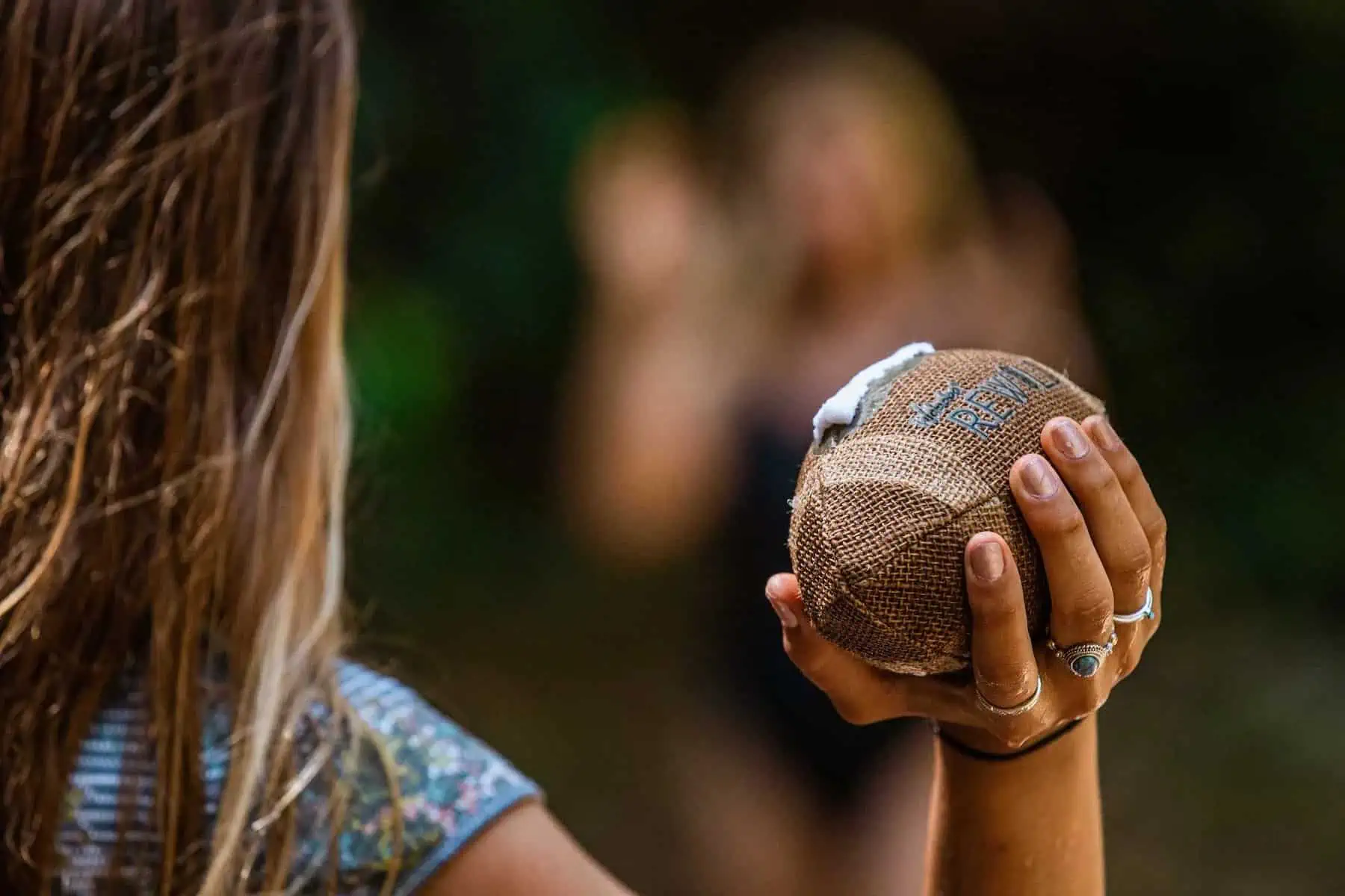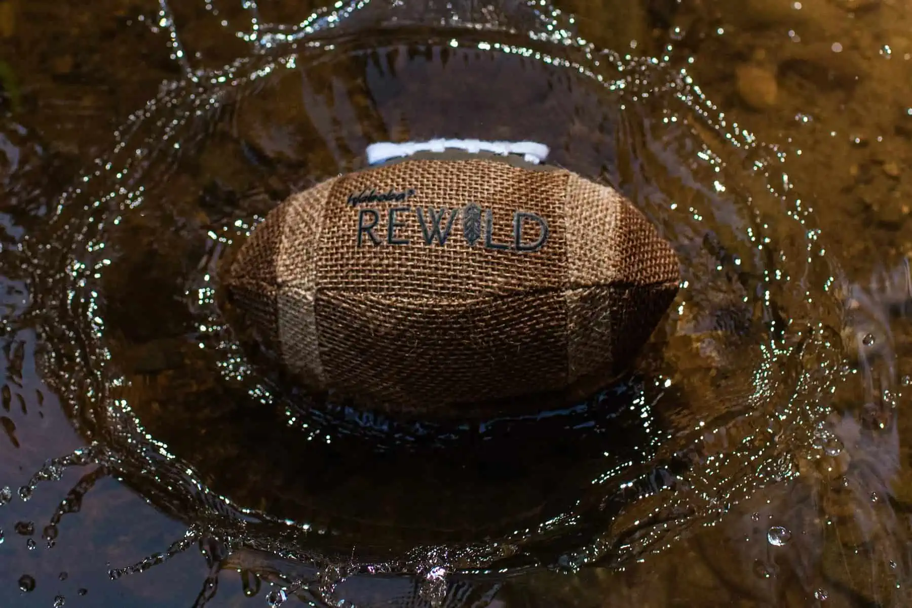 Umweltfreundlicher Football aus Jutestoff und natürlichem Gummi. Perfekt zur Verwendung am Strand.