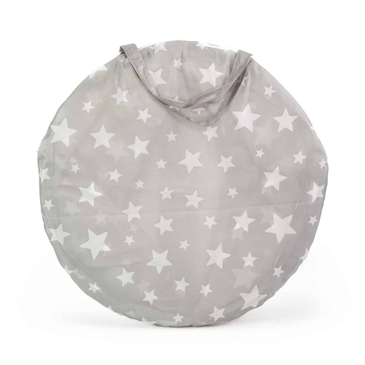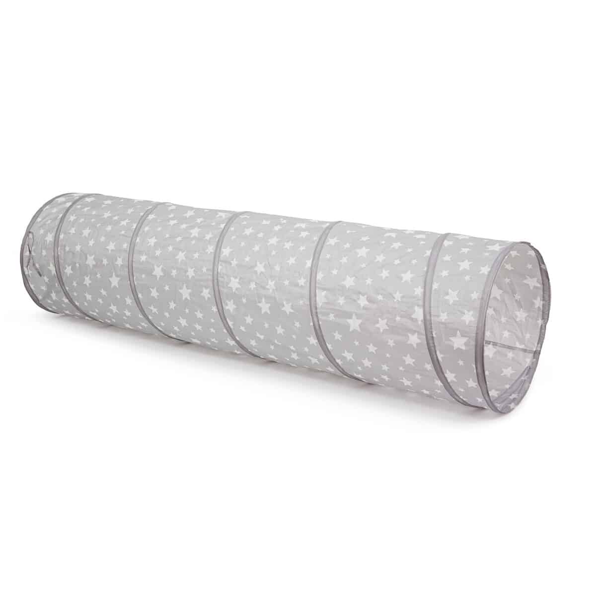 Spieltunnel aus Polyester mit kreisförmiger Grundfläche. Drinnen und draußen verwendbar. Erhältlich in Grau, Rosa oder Blau. Mit Sternenmuster.