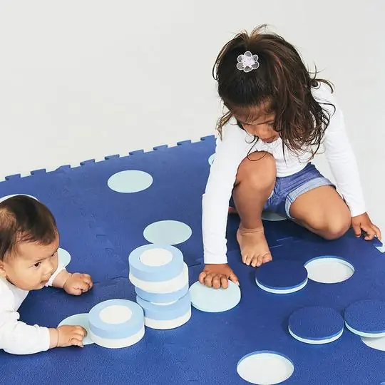 Bodenmatte zum Toben oder Ausruhen inklusive Trittsteine für Bewegungsspiele. Leicht zu reinigen, hinterlässt keine Spuren. Erhältlich in Blau, Grau oder Rosa.