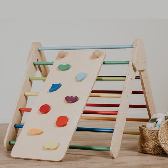Pikler-Dreieck  inklusive beidseitig nutzbarer Kletterrampe. Erhältlich in den Farben Bunt, Pastell oder Natur.