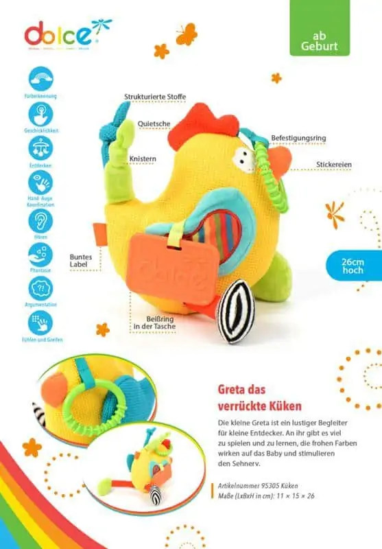 Alle Lern-Kuscheltiere von Dolce sind so besonders wie Greta das verrückte Huhn. Denn sie haben alle ein einzigartiges Design mit vielen Details, die zum Entdecken einladen. Dadurch fördern sie etwa die Fähigkeit, verschiedene Dinge durch Fühlen unterscheiden zu können. Auch für das Lernen durch das Gehör sind Elemente dabei. Insgesamt profitiert die Entwicklung vom Spielen mit den Dolce Tieren, die Hand-Auge-Koordination und motorische Fähigkeiten werden gefördert.