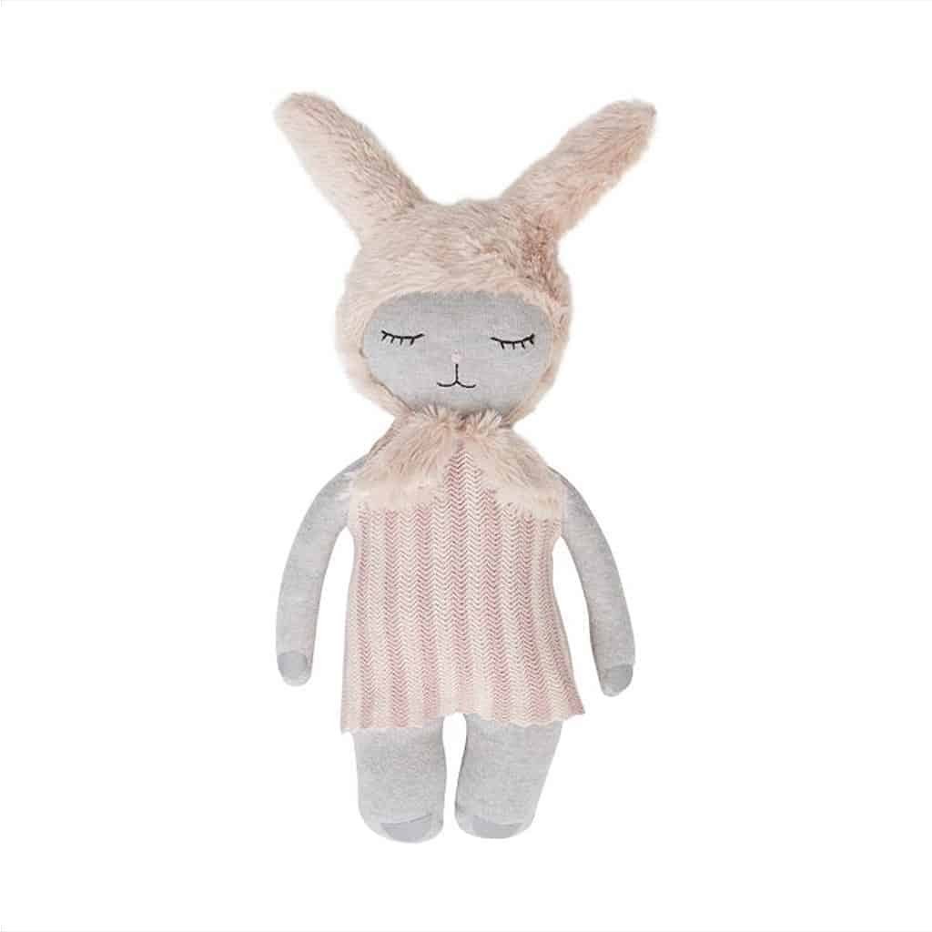 Stoffhase mit weicher Füllung und flauschiger Kapuze, die sich beim Kuscheln besonders toll anfühlt. Zur Reinigung wird empfohlen, Flecken mit einem feuchten Lappen abzuwischen.