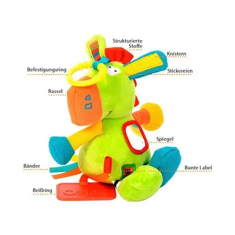 Buntes Lern- und Kuscheltier mit vielen Details zum Entdecken, etwa verschiedene Texturen und Materialien, Geräuschelemente, eine Beißplatte, einen Spiegel und etliches mehr.