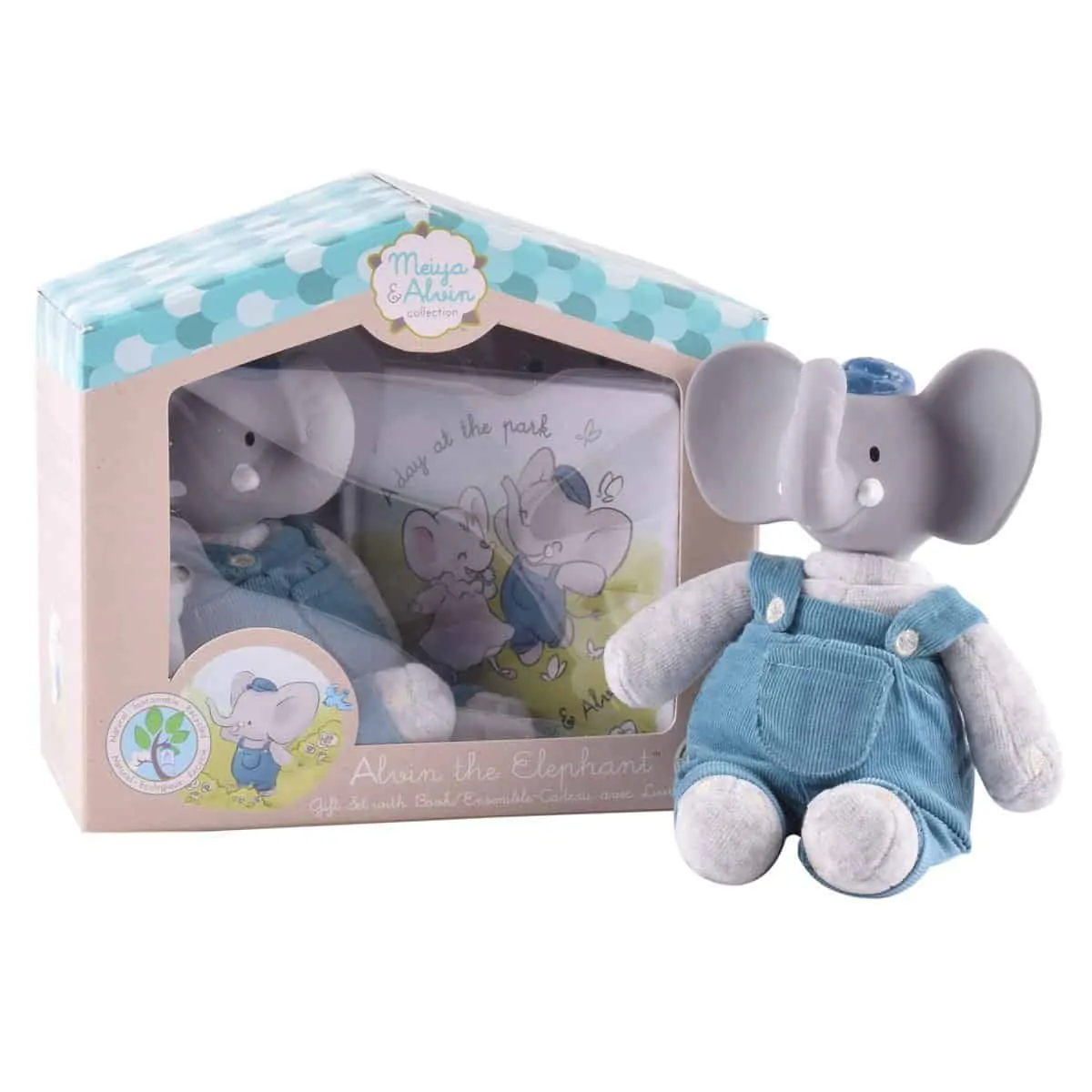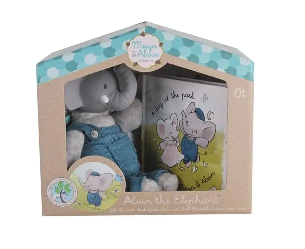 Das Alvin Geschenk Set enthält neben dem Kuschelelefant Alvin mit Gummikopf auch ein Buch, das mit farbenfrohen Illustration die Geschichte von Alvin und seiner besten Freundin Meiya erzählt. Es eignet sich perfekt als Geschenk für Neugeborene und Kleinkinder, die gerade Zähne bekommen.