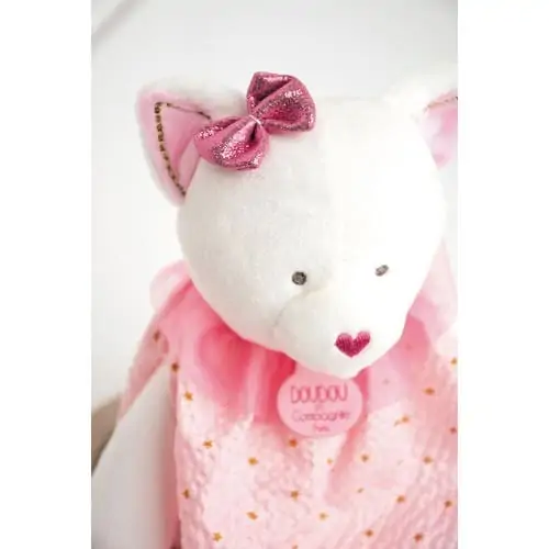 Die Histoire d’Ours Traumfänger Katze mit Schmusetuch mit 28 cm Durchmesser ist einer der treuen Begleiter aus der Traumfänger-Reihe. Diese kuscheligen Freunde sind Schmusetuch und Stofftier zugleich. In dieser Variante bringt die weiche Stoffkatze ihr eigenes Schmusetuch mit. So kannst du mit ihr spielen und kuscheln. Die Schleifen und Bänder fühlen sich dabei für neugierige kleine Hände sehr interessant an.