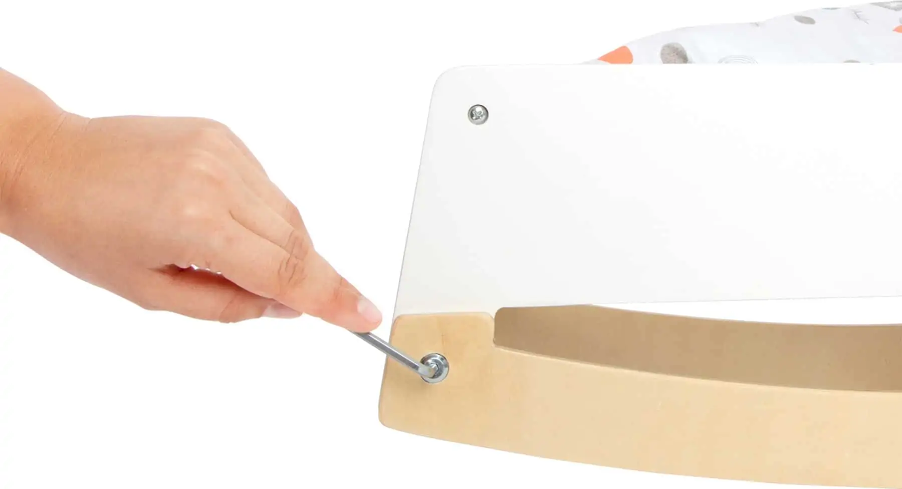 Die Small Foot Puppenwiege aus der Reihe „Little Button“ bietet einen schönen Schlaf- und Rastplatz für alle deine Puppen und Kuscheltiere bis zu einer Größe von 46 cm. Dank eines abnehmbaren Baldachins sind sie dort vor Licht geschützt. Du kannst sie liebevoll in den Schlaf wiegen, während sie sich am Mobile erfreuen. Du kannst die Kufen der Wiege auch abnehmen und sie deinen Puppen und Kuscheltieren als Liegestuhl zur Verfügung stellen. Um sicheres Spielen zu gewährleisten, sind alle Kanten abgerundet. Die weiße Farbgebung der Puppenwiege weiß sowohl Mädchen als auch Jungen zu gefallen. Die Wiege ist für Kinder ab 3 Jahren geeignet und passt perfekt zu allen anderen Produkten der „Little Button“-Reihe.