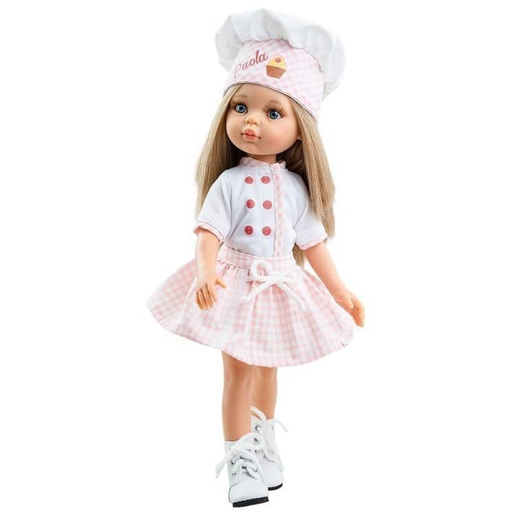 Die Paola Reina Puppe Carla als Bäckerin, 32 cm, mit blondem Haar und blauen Augen. Vinylkörper mit beweglichen Gelenken, geeignet für Kinder ab 3 Jahren. Inklusive Kamm.