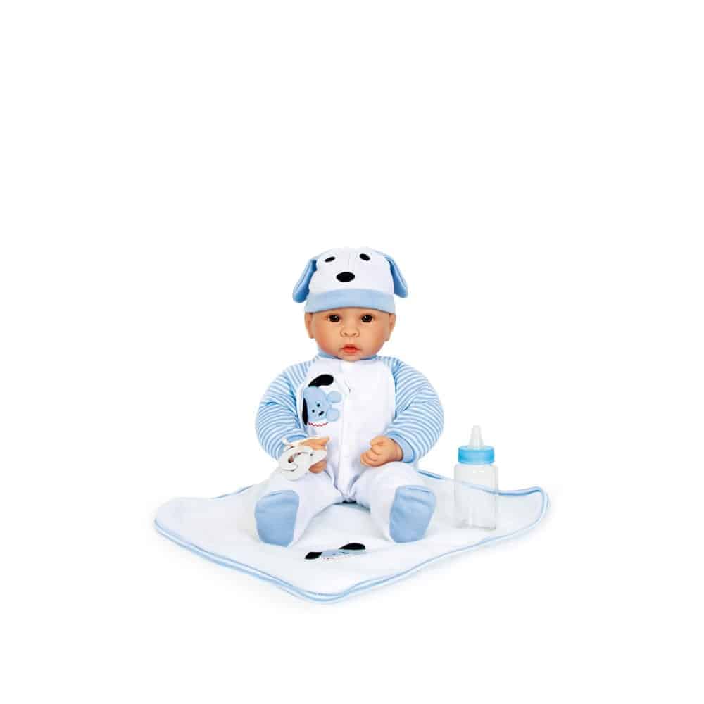 Stoffpuppe im Hündchenoutfit inklusive Schnuller, Fläschchen und Kuscheldecke. Passt perfekt in die Puppenwiege und den Hochstuhl.