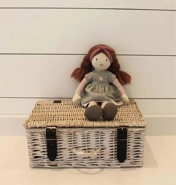 Weiche und kuschelige Schlenkerpuppe mit blauem Kleid und Ringelstrumpfhose. Verpackt in feinem Papier und schicker Geschenkbox.